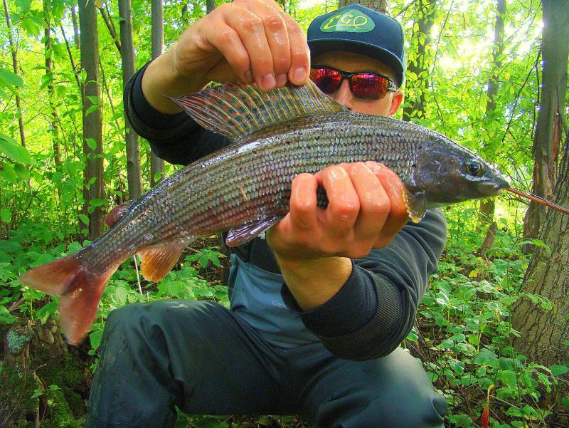 Albo dwa piękne kardynały złowione rzut po rzucie, z tego samego miejsca, spod tego samego korzonka. Jakież było moje zdziwienie, kiedy szykując statyw do wykonania zdjęcia złowionemu na suchą muszkę lipieniowi zauważyłem, jak dosłownie tam skąd dopiero co go wyciągnąłem, jak gdyby nigdy nic zbiera sobie spływające owady kolejna ryba. Wysuszyłem prędko malutką jęteczkę, precyzyjnie podałem, a lipień po prostu ją wessał, wprawiając mnie w stan osłupienia. W ten oto sposób dwa dorodne okazy czekały zanurzone we wrzuconym w nurt podbieraku na swoją kolej do wzięcia udziału w pamiątkowej sesji fotograficznej ![]()