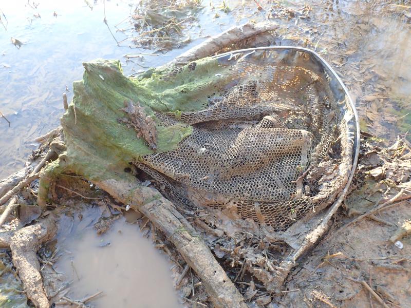 Siatka nienaruszona, domowej roboty smycz z przyponu sumowego 200 lb uległa biodegradacji. Rama podbieraka straciła kolor. Ale jest !