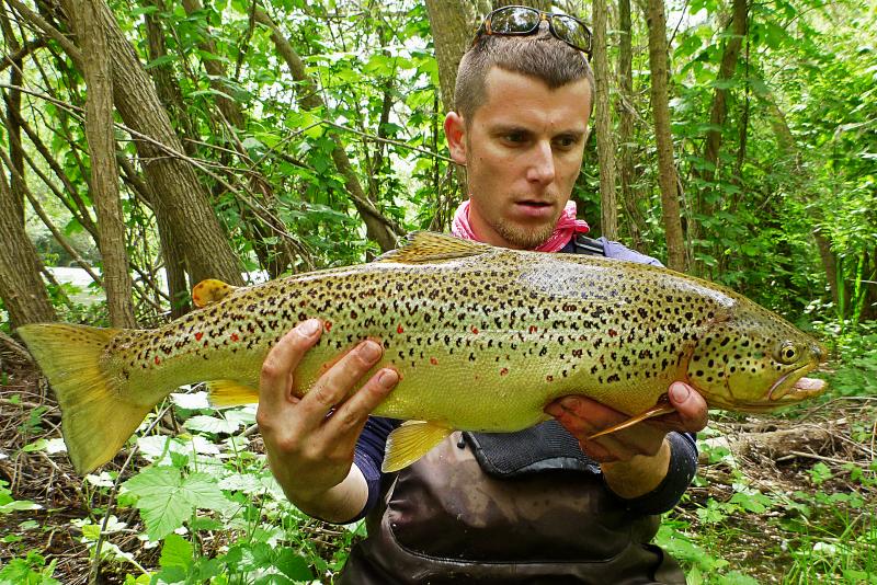 Otóż podczas marszu przez płytki, acz szeroki odcinek zauważyłem wjazd ryby na płyciznę. Coś jak boleń w super płytkiej zatoce za ostrogą goniący jedną rybkę aż na brzeg. Tylko, że tu była lita skała, a ryba która wjechała to był pstrąg. Czy dogonił nie wiem . Rzuciłem na ciut głębszą wodę, dokąd wrócił po pościgu. Równe prowadzenie z nurtem. Żadnych wygibasów, po prostu płynąca z nurtem rybka.Na branie nie czekałem 2 sekund. Mucha skasowana. Cała w pysku. Zdjęcie pstrąga poniżej. Agresywny samczyk w całej okazałości (to ten w kropki, nie ten trzymający).