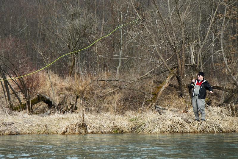 Pływająca linka i tonący przypon pozwalały na rzuty które szczególnie lubię, rzuty skośnie pod prąd z szybkim wybieraniem obserwowanej linki.Kilka pstrągów tak właśnie złowiłem, zacięcia są bardzo pewne, często ryba pokazuje się pod powierzchnią w upragnionym złotym błysku.