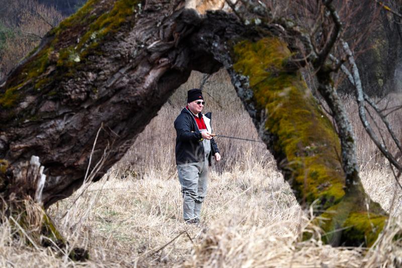 A temu wszystkiemu przygląda się nasz wspaniały muszkarz nietuzinkowy - Grześ. Jego ciepły uśmiech, dobre słowo.... Co mu tam te Hatche, Nautilusy, Heliosy, Winstony.....te spory, swary, te korki i inne duperele..... Grzesio już pierwszego dnia pokazał, że w każdych warunkach i niekoniecznie mocząc tyłek w wodzie można skutecznie połowić, a w dniach kolejnych nie ustępował. Jako pierwszy miał na koncie "czterdziestaka".
