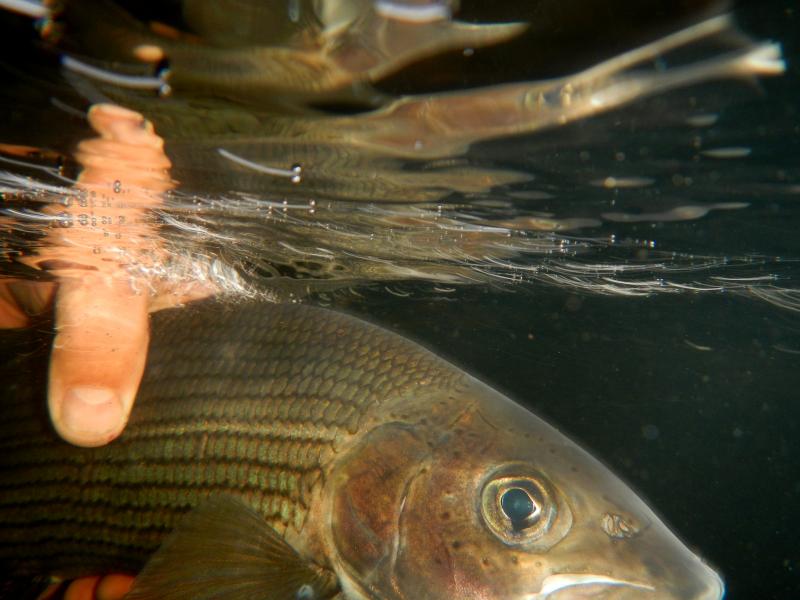 Gdy Piotr szykował aparat do zdjęć dokumentujących uwolnienie ryby, gdy ja chwytem po brzuszkiem i za kitę zanurzyłem rybę by rozpocząć reanimację...olbrzymi potokowiec z impetem bryknął w głębinę chlapiąc na mnie i mocząc okulary. Co za kozak!