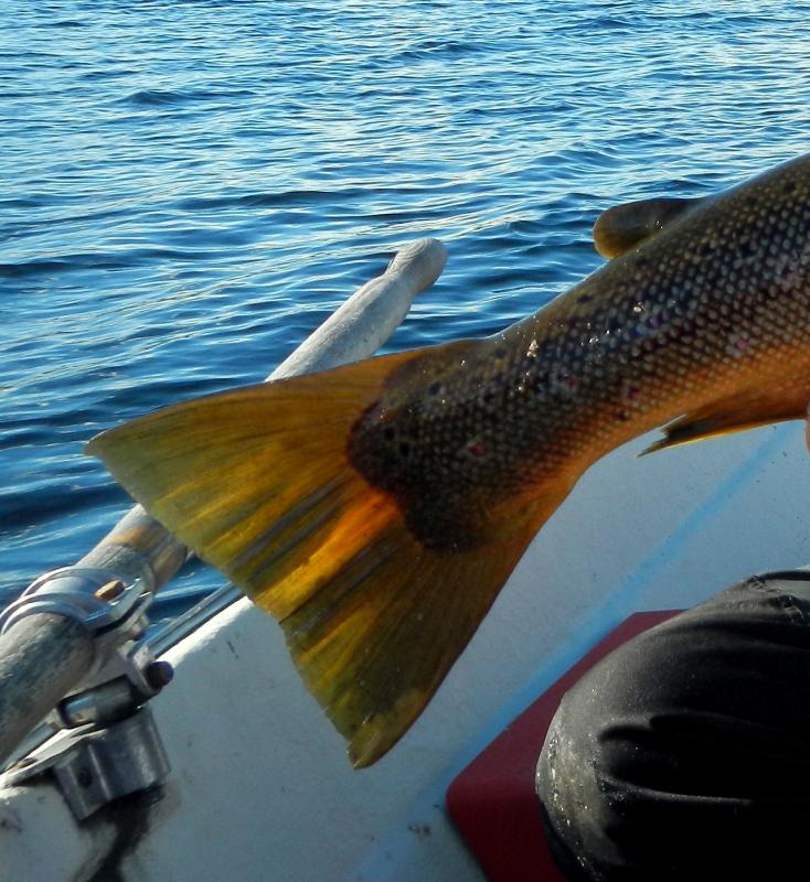 Zacinam z ręki, natychmiast przechodząc na hol z kołowrotka, Piotr delikatnie wycofuje łódkę ku środkowi jeziora. Ryba w pierwszej chwili jest zdumiona tym dziwnym oporem, ale po chwili linka opuszcza szpulkę Lamsona. Po dłuższej chwili orientujemy się, że spryciarzem jętkojadem okazał się pstrąg potokowy (co nie było przecież oczywistym) i że jest większy niż sądziliśmy.