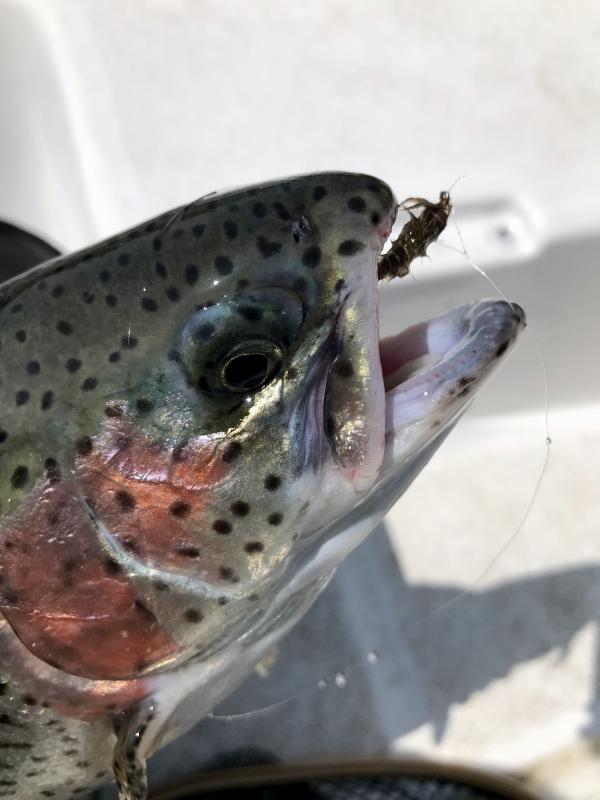 Co ciekawe łowiąc w jeziorach sięgam do długo nieużywanych lekkich nimf na dość dużych hakach. Jedna z nich jest widoczna na zdjęciu w pysku pstrąga tęczowego, tam trochę wyżej, widzicie? Leżała w pudle całe lata i czekała na patrolującego wodę, mającego wszystko w tyle tęczaka. Ryba uciekała na widok