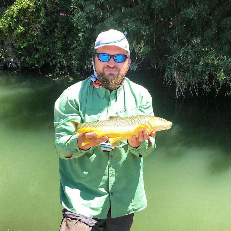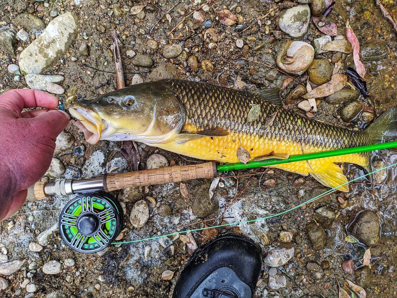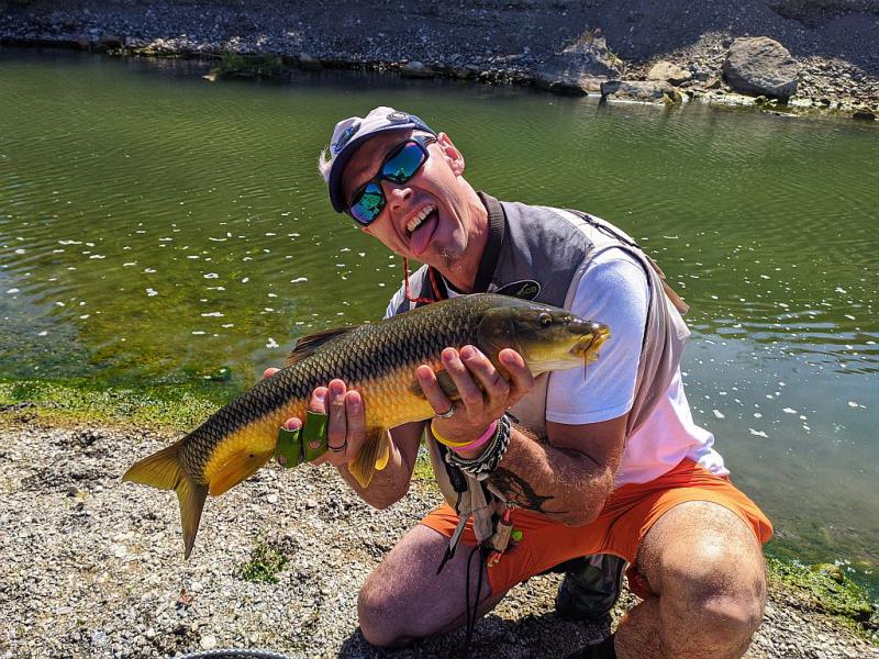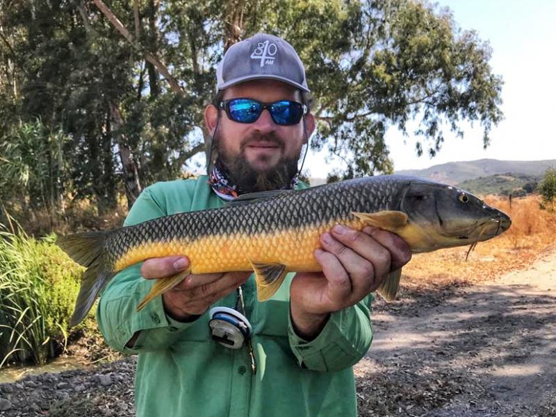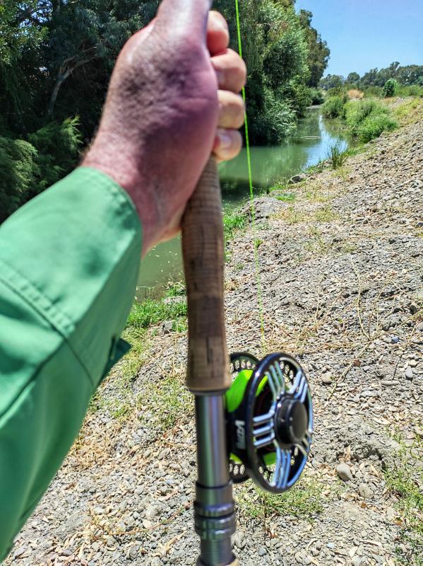 Na kanale rzuty są bardzo krótkie, rzadko kiedy za szczytówką więcej niż 3m linki plus przypon. Czasem rzut nie trafiony przed rybę daje branie - kwestia wyczekania i poruszenia muchą w odpowiednim momencie. Hiszpańśkie brzany są temperamentne, nie dość że żrą chętnie z wierzchu to jeszcze nie lubią jak im kotlet ucieka z talerza. Na kanale łowię głównie na żuczki. Białe, czasem czarne, czasem szare. Też coś między wolly buggerem a gurglerem, przypuszczam ze dla ryby przypomina to kijankę będącą częstym smakołykiem - reagują na nie bardzo dobrze.
