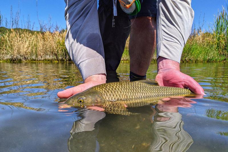 Rozlewisko ma ciemnoniebieską wodę, łowienie typowe na upatrzonego. Podanie linki na dużą odległość do wypatrzonej ryby, kilkanaście cm przed głowę. Jeden zły ruch i jest headshoot i żuczek ląduje brzanie na głowie. Rzut za daleko - i ryby nie zareaguje na "plump" wpadającej do wody muchy. Dodaj do tego rybę poruszającą się po miejscu, zmieniającą kierunek, inne ryby idące ciut głębiej i nie widoczne z odległości 25m, ale robiące panikę jeśli coś wyląduje im na głowie... W efekcie skuszenie brzany nie jest aż tak łatwe.