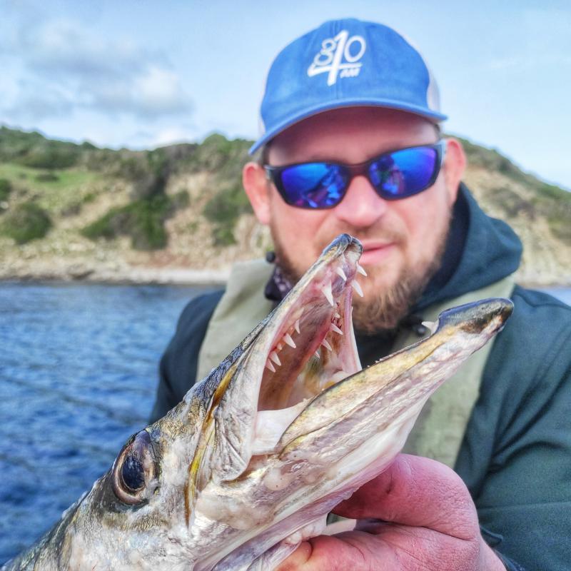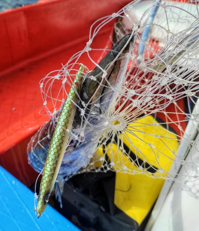 Ustawiamy łódź tak by wiatr i prady niosły nas krawędzię stada (z bliska okazuje się być gigantyczne, dobre 20 na prawie 100m), W zasiegu rzutu, na wyłączonym dużo wcześniej silniku mijamy rybki, rzut za rzutem nasze przynęty lądują między drobnicą. Chyba w trzecim rzucie - Fryta ma dobre branie, z samego wierzchu. Chova na bank, niestety spina się po kilku sekundach. Kilka rzutów dalej i powtarza się sytuacja - wędka dogięta do wody, ryba chyba niedocieta odpowiednio - kilka sekund i schodzi. No dobra, do trzech razy sztuka, w kolejnym dryfie idziemy pod trochę innym kątem, mijamy stado od strony brzegu. Rzut równolegle do rybek i tym razem fRyta tnie chovę prawie z saltem do tyłu. Początkowo ryba chyba lekko znokautowana uderzeniem w kły, idzie dość równo do łodzi. Gdy tylko widzi pomarańczowe światełko łodzi ożywa, nabiera wigoru. Z gwizdem znika linka z kołowrotka, odjazd na dobre 30-40m, jestem pod wrażeniem. Z powodu wiatru i fal trochę ciężko ustać, ale po dłuższej chwili udaje się nam dziada wpakować w siatkę.