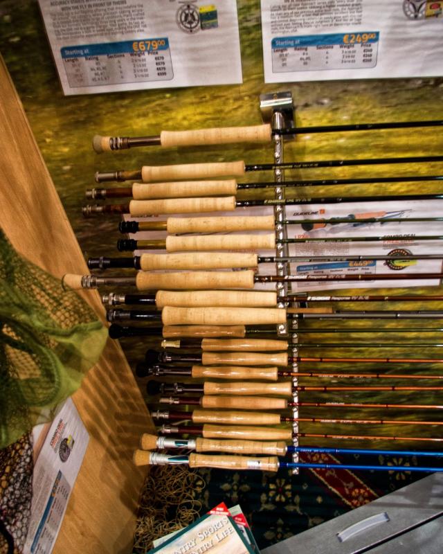 Lecę dalej - ściana Rio/Airflo, kawałek dalej do wyboru Hardy/Greys. Wędki zacne, ale niestety czasy, gdy Greys był budżetową marką mamy za sobą...
