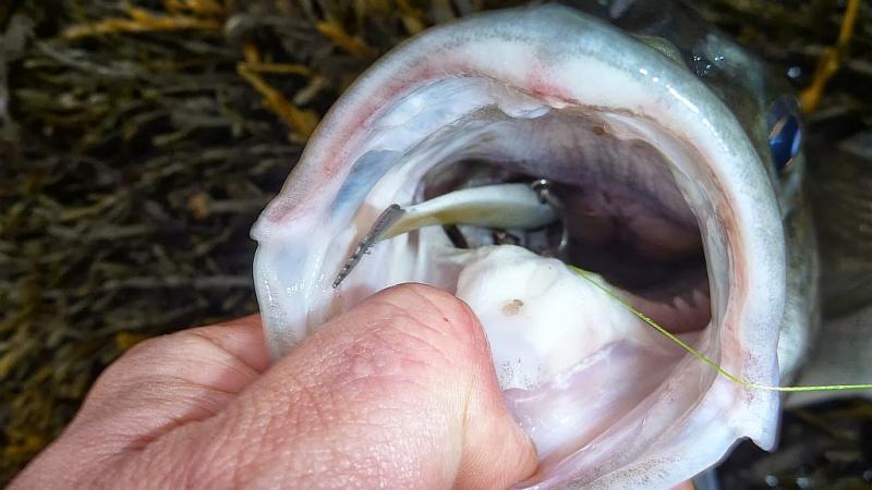Brania Bassów na przynęty miękkie są zwykle bardzo delikatne. Wydawać by się mogło, że będzie je bardzo trudno zaciąć łowiąc przecież sporą przynętą uzbrojoną w pojedynczy hak. Nic bardziej mylnego! Zacinam praktycznie wszystkie brania na gumy uzbrojone w haki offsetowe. Ryby bardzo, ale to bardzo rzadko spadają, a ich podbieranie jest bardzo łatwe. Wystarczy pewny chwyt za dolną szczękę, podobnie jak przy podbieraniu amerykańskich bassów wielkogębowych. Ryby po wyholowaniu są bez problemu wyhaczane i szybko i bez komplikacji wracają do oceanu.