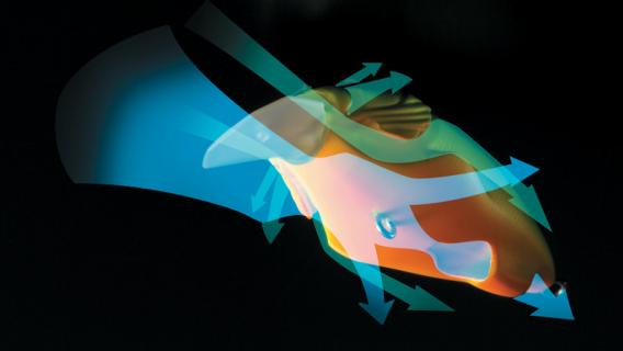 Kolejnym czynnikiem wpływającym na głębokość nurkowania H jest siła nurkowania FN, którą głównie generuje ster, ale nie tylko. Kształt korpusu również może sprzyjać, bądź nie, głębokości nurkowania H woblera. Zwykle trudno jest rozpatrywać jednoczesny wpływ wielu czynników. Stąd poddano analizie oddzielnie wpływ korpusu i steru na opływ woblera przez wodę i wynikające z tego konsekwencje. Kształt korpusu ma istotne znaczenie w jaki sposób woda go opływa. Na rys.1 zaprezentowano rozkład ciśnienia na powierzchni korpusu woblera klasycznego, a uzyskany został podczas komputerowej symulacji jego opływu przez wodę.