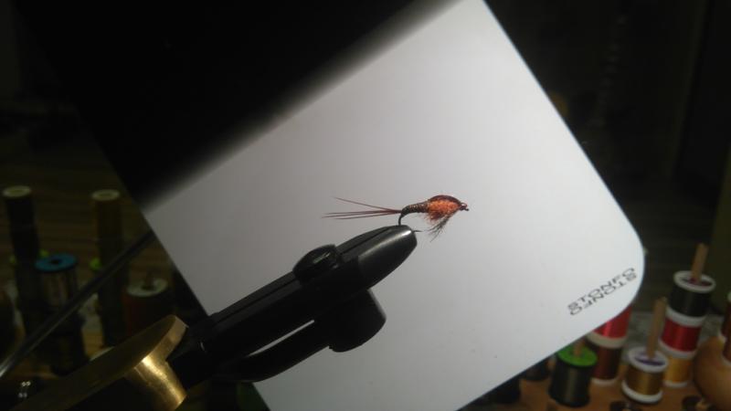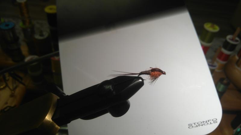 -zrobiłem ją w pomarańczu i brązie, użyłem bażanta barwionego na burgundowo i dubbingu w podobnym kolorze (burgundowy opos i rudy antron)