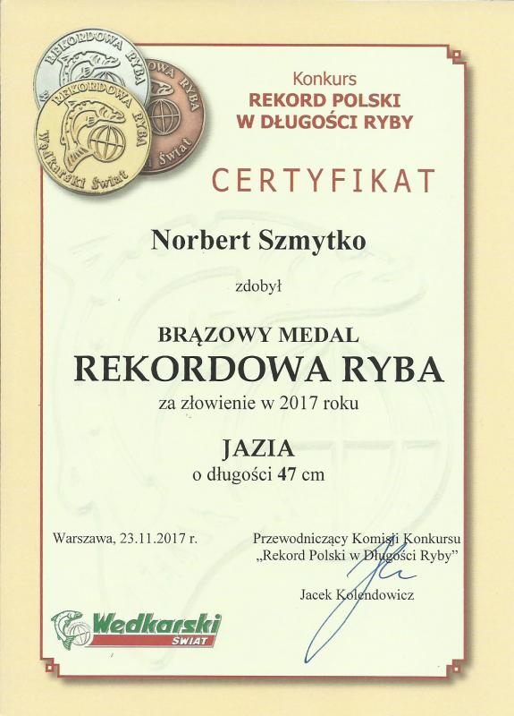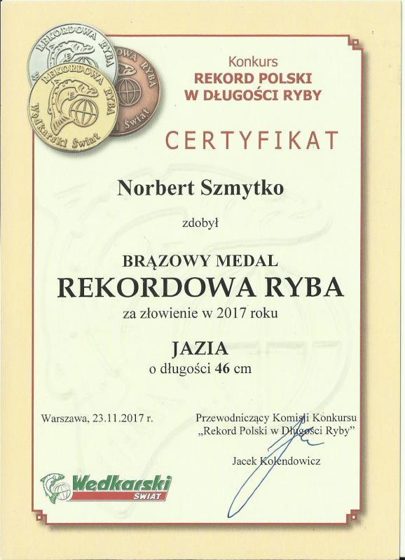 Norbert 78 Opublikowano 19 Stycznia 2018 Zgłoś Udostępnij Opublikowano 19 Stycznia 2018 Gratuluję przyjacielu, jak długo oczekiwałeś na taki certyfikat,podrzucić jeszcze zdjęcie medalu, najlepiej w porównaniu z czymś wielkościąMedal nie jest duży, jest w formie przypinki np, do kamizelki. Kurcze.... Tak myślę, a po co Ci ten papierek i ta blaszka? Nie lepiej zdjęcie ryby odprawić? Tak z czystej ciekawości pytam... Bez żadnych podtekstów... Oprawiam certyfikaty i wieszam sobie na ścianę, zdjęcia największych ryb z danego gatunku też mam oprawione ale nie wszystkie. 3 Cytuj Odnośnik do komentarza Udostępnij na innych stronach Więcej opcji udostępniania...