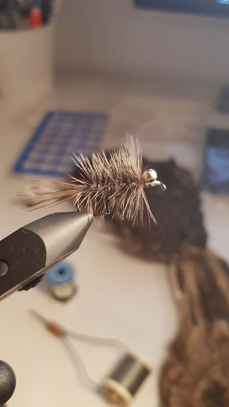 7. Nawijamy na trzonek haka tułów z dubbingu. Wyczesujemy.