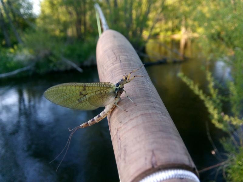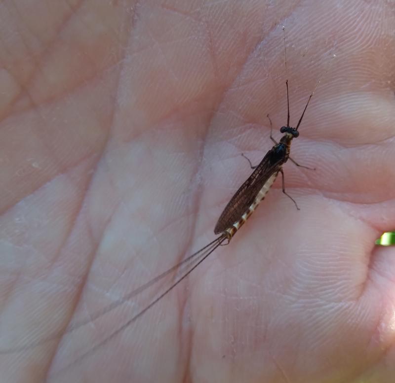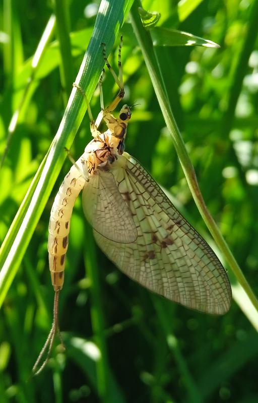 Jeśli dobrze widzę, to ciemne podłużne plamki są tylko na górnej części segmentów 6-9 odwłoka, co wskazywałoby na Ephemera danica. Zresztą widać (też po oczach), że jest to panna Dunka, blondyna. Vulgatki (nie mylić z vulgarnymi) są raczej szatynkami albo wręcz brunetkami, ale dużo zależy od wody, w której żyją.