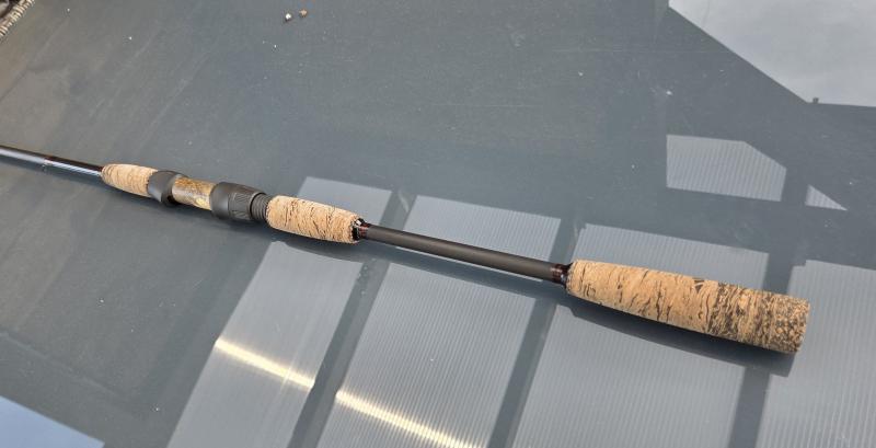 Uzbrojony w przelotki fuji sic titanium w złotej ramce, uchwyt carbonowy crs i rękojeść z korka Tiger z elementami żywicy
