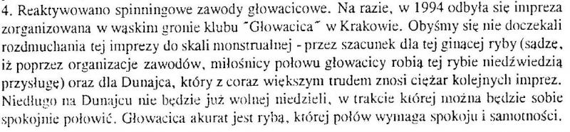 W najnowszej, już tej nieromantycznej historii wędkarstwa głowacicowego w Polsce jak w zwierciadle odbija się ruska mentalność i podejście do zasobów rzeki w wykonaniu polskiego wędkarza - jak gdzieś pojawią się duże ryby to trzeba szybko je wybić, najlepiej do spodu, żeby dla innych nie zostało. Dlatego naiwne, oderwane granatem od realiów założenie, którego echa widoczne są w wypowiedziach autorów zaproszonych do współtworzenia książki, że popularyzacja tego gatunku spowoduje jakieś wzrosty czy rozwoje lokalnych biznesów i zainteresowania władz co z kolei przełoży się na większą troskę o gatunek i tak w kółko, okazały się szkodliwą mrzonką. Co gorsze, mrzonką były od samego początku. To był grzech pierworodny wszelkich akcji popularyzatorkich - rozkrzyczeć na całą Polskę, że w Dunajcu i Popradzie pływają metrowe i większe ryby, okrasić to pięknymi zdjęciami okazów i dać byle komu pełną wiedzę jak, gdzie i kiedy łowić tę rybę przy śmiechu wartych, matrwych przepisach ochronnych i zerowych kosztach pozwoleń na połów tej ryby (pomijam żenującą dopłatę za spinning w okresie jesienno zimowym w wysokości 50 zł czy coś koło tego). Owszem, w latach głowacicowego boomu czyli od 1995 do, powiedzmy 2005 dał się zauważyć pewien wzrost zainteresowania tą rybą ze strony przyjezdnych wędkarzy ale na podstawie własnych obserwacji wiem, że przyjezdny łowca głowacic to był głównie klient niskobudżetowy - jakiś tani nocleg, może być na nieogrzewanym poddaszu byle był niedrogi, pół kilo kiełbasy i flaszka na kolację, pasztet i dwa piwa na śniadanie - śmiech na sali w porównaniu do tego co zostawiają narciarze i, biorąc pod uwagę ich liczebność turyści górscy. Problem główny polegał jednak na czymś innym. Po 1995 na głowatkę ruszyli szeroką ławą miejscowi wędkarze, którzy do tej pory poza punktowymi wyjątkami nie mieli pojęcia jak się tą rybę łowi.   Pamiętam, z lat przedpucharowych miejsce Pod Strażnicą, w zasadzie w centrym wsi, gdzie głowatki łowił jeden, słownie JEDEN wędkarz miejscowy, nawiasem mówiąc znakomity łowca okazów tej ryby i producent równie znakomitych woblerów z buczyny, znany niektórym Janek Z. Ja sam pamiętam przypadki, ze chodząc po Dunajcu tydzień po tygodniu rozponawałem swoje ślady na śniegu z poprzedniej wyprawy i były to jedyne ślady woderów nad wodą. W wyniku wybuchu zainteresowania miejscowi szybko zorientowali się jakie ryby pływają koło ich domów, podpatrzyli krakowskich speców i w tygodniu, po cichutku, dzień pod dniu, rankami, wieczorami i po nocach głowatki wyjeżdżały jedna po drugiej spod Strażnicy, z płani pod zaporą, spod wodomierza.