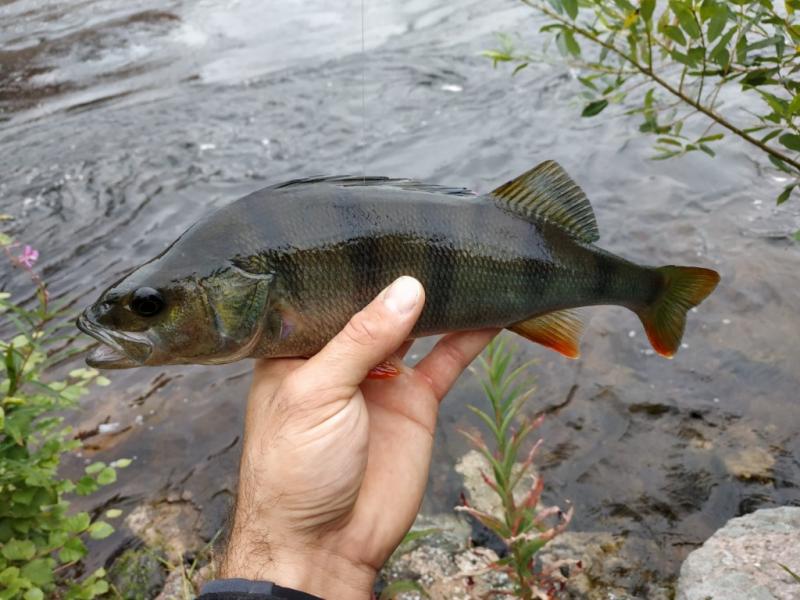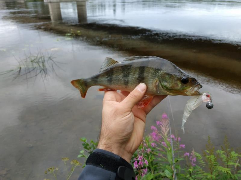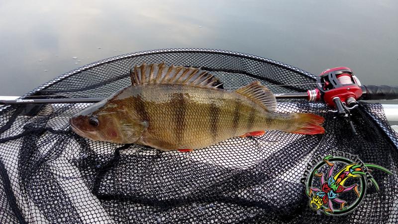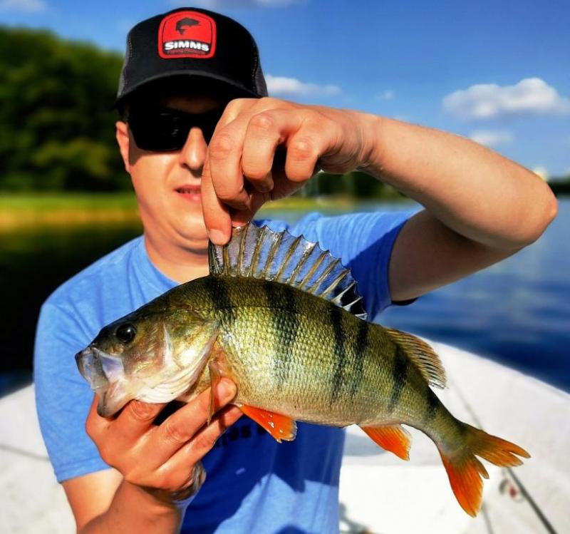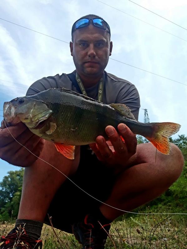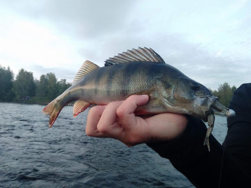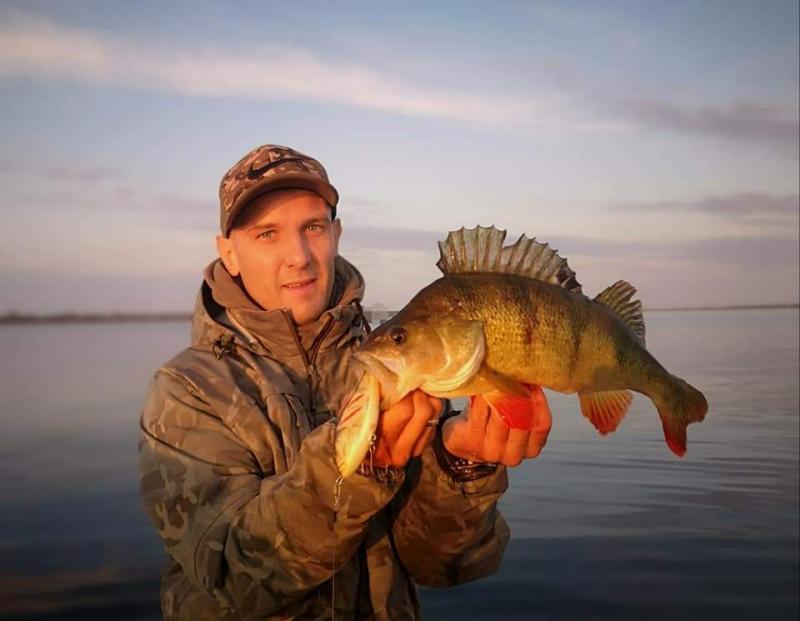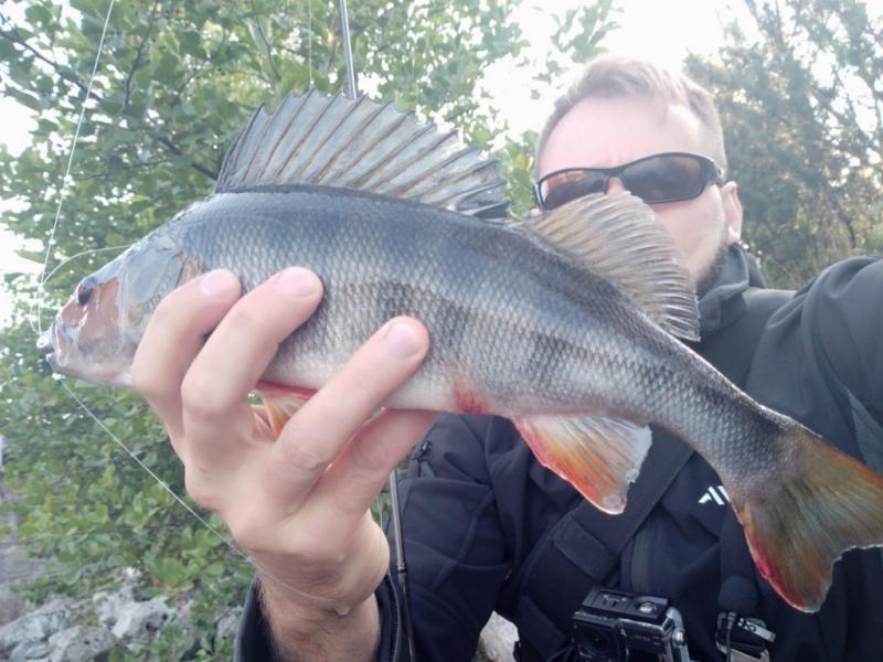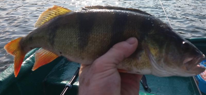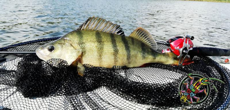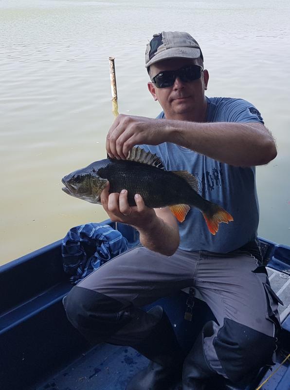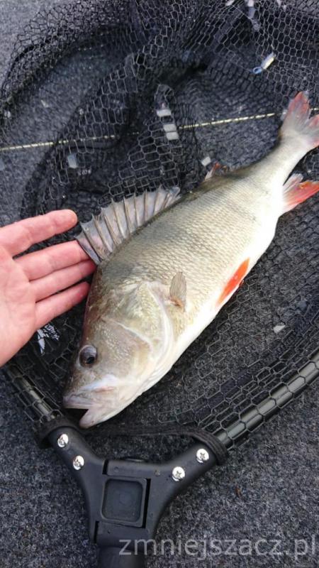 Po kilkunastu tradycyjnych rozmiarowo pasiaków przynętę zassał on. Może nie pradziadek ale ojciec tej okoniowej młodzieży.