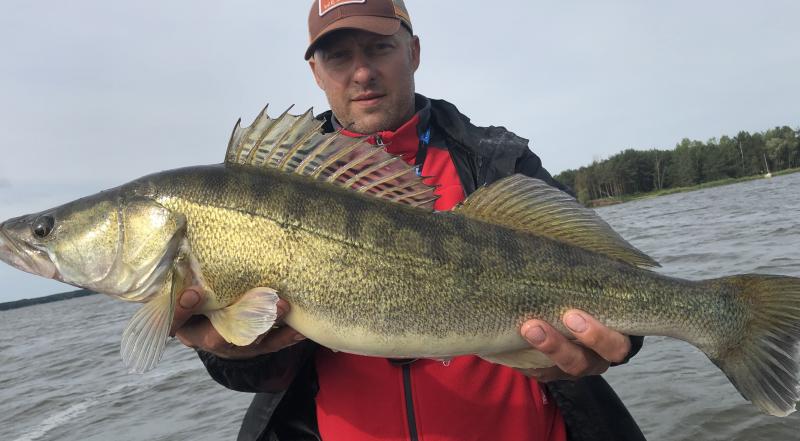 Po raz kolejny zajrzałem do pudełek i w geście rozpaczy założyłem brudnego rakopodobnego coś z Gunki. Widziałem to kiedyś w PerchPro jak Frederic na to łowił i gdy znalazłem w sklepie w Szwecji to kupiłem. Na miejscu w Szwecji nie miałem na to nawet brania, jeśli chodzi o okonie. Był nabity na jakąś główkę, nawet jej nie zmieniłem. Zrobiłem już z 5 rzutów i ten miał byś ostatni. Rzuciłem pod brzeg, szuram po dnie po raz kolejny... Nagle coś siadło, ale nie puknęło jak sandacz, tylko siadło jak reklamówka. Na początku myślałem, że to jakiś leszcz za dupę, bo bez walki szło po przekątnej łodzi i nurtu. Przy łodzi zaczęło pulsować i walczyć. Jak pokazał się na powierzchni to zaczęła się panika na łodzi. Byłem na wodzie z dziadkiem i kolegą - fotografem. Nie spodziewaliśmy się większych ryb, więc podbierak leżał sobie w bakiście razem z kijami, zaplątany w przynęty. Pod ręką miałem tylko mały podbierak na okonie, kosz ma chyba 45 cm długości. Kolega w panice zaczął skakać po pokładzie i wyciągać większy podbierak z bakisty. Nie dość, że zahaczony o woblery, to jeszcze ciężko go wyjąć, bo BFT monster net XL w bakiście na wędki ledwo się mieści. Ja już rybę mam przy burcie, czekam na nią z małym podbierakiem w ręce, ale na szczęście kolega wydostał większy, szybkie rozłożenie i podebranie... Poleżał trochę w podbieraku, my się uspokoiliśmy, 10 fotek i do wody:) Życiówkę poprawiłem o 2 cm, w dokładnie tym samym dole, gdzie wyciągnąłem poprzednią, dwa lata temu :)