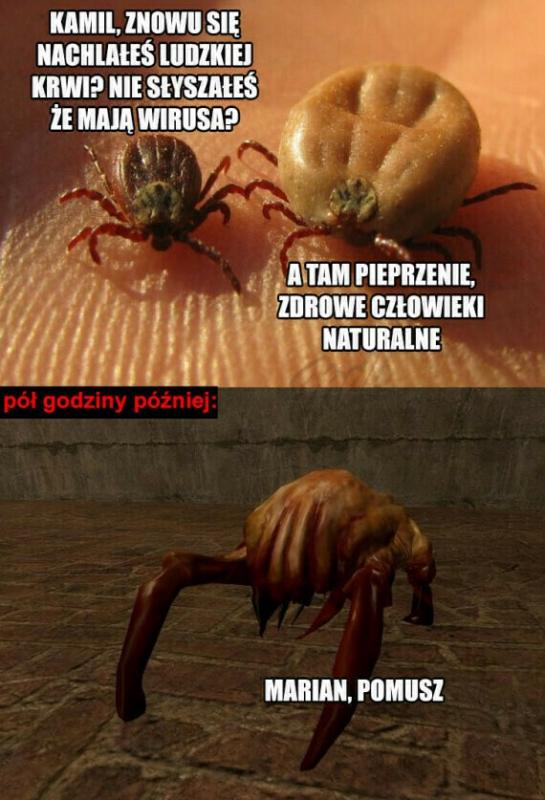 AdasCzeski Opublikowano 25 Maja 2020 Zgłoś Udostępnij Opublikowano 25 Maja 2020 anpart ostatni mem z posta wcześniej.... "wiem, wiem po prostu powolutku sobie idźcie"... nie wiem ale nie mogę przestać się śmiać. Uwielbiam czarny, cięty humor, a jak łączy nieco absurdu to już jest idealnie. Przykład. Chyba ten dowcip już tu pisałem, ale co tam. Wychodzi gość z dzieckiem na spacer. Cięgnie je za nóżkę po schodach, a główka tak o stopnie... bach...bach...bach. Słysząc hałas wychodzi sąsiadka i krzyczy - Jezus Maria, co Pan robisz przecież mu czapka spadnie. Niech się Pani nie martwi przybiłem gwoździem. albo Dwoje dzieci zamknięto w saunie celem sprawdzenia reakcji na temperaturę. Zdrowe dziecko i z wodogłowiem. 50 stopni. Nic dzieci się bawią nic się nie dzieje. 60 stopni zdrowe dziecko całe czerwone ale bawi się, dziecko z wodogłowiem bawi jak gdyby nigdy nic. 80 stopni dziecko zdrowe woła o pomoc, chce uciec, dziecko z wodogłowiem bawi jak gdyby nigdy nic.100 stopni dziecko zdrowe nie daje oznak życia, dziecko z wodogłowiem... tu trzeba zacząć gwizdać. 4 Cytuj Odnośnik do komentarza Udostępnij na innych stronach Więcej opcji udostępniania...