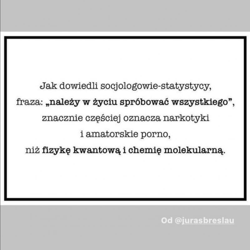 100icki Opublikowano 10 Października 2020 Zgłoś Udostępnij Opublikowano 10 Października 2020 Osiemnastoletnia dziewczyna przyszła do swojej matki i mówi jej, że okres jej się spóźnia o dwa miesiące. Przerażona matka pobiegła do apteki po test ciążowy i po chwili wiadome jest, że dziewczyna jest w ciąży. Zdenerwowanamatka krzyczy:- Co za świnia Ci to zrobiła. Musisz mi powiedzieć, chcę go poznać.Więc dziewczyna pobiegła do pokoju i zadzwoniła do znajomego.Po pół godziny pod dom zajeżdża nowiutkie Ferrari, z którego wysiada przystojny, elegancko ubrany gość w średnim wieku.Wszyscy siadają przy stole i gość mówi:- Wasza córka powiedziała mi, o co chodzi, ja jednak niestety, ze względu na moją rodzinę, nie mogę się z nią ożenić. Jednak zapewniam Was, że nie chcę się migać od odpowiedzialności, więc jeżeli urodzi się córka, to zapiszę jej 3 sklepy i milion dolarów. Jeżeli to będzie syn, to dostanie 2 fabryki i milion dolarów.A gdy urodzą się bliźniaki, to dostaną po 5 milionów dolarów. Jednak jeżeli wasza córka poroni...W tym momencie wtrąca się ojciec, który od samego początku nie odezwał się słowem:- To przelecisz ją jeszcze raz. 6 Cytuj Odnośnik do komentarza Udostępnij na innych stronach Więcej opcji udostępniania...