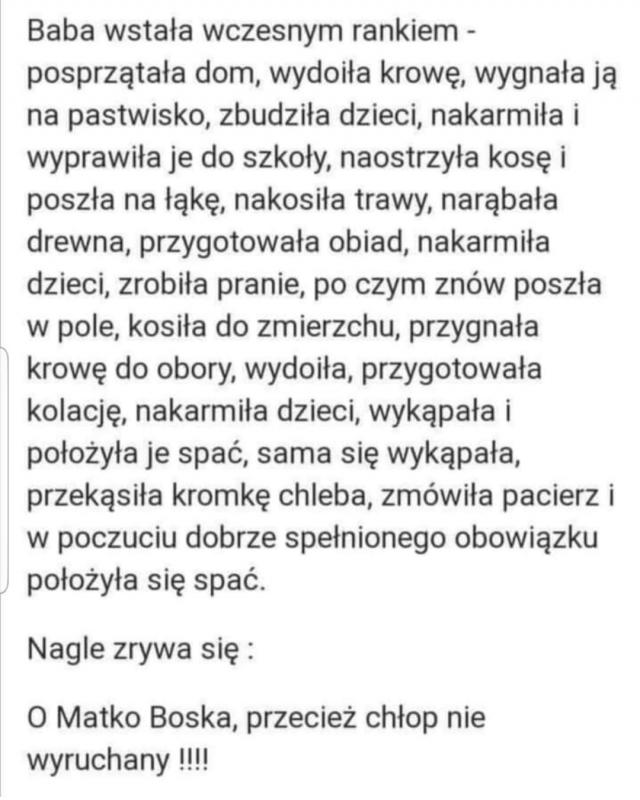Sławomir Opublikowano 11 Października 2020 Zgłoś Udostępnij Opublikowano 11 Października 2020 (edytowane) Na ruchliwym skrzyżowaniu stoi młoda, ładna policjantka i kieruje ruchem. Nagle stwierdza, że zaczyna się u niej okres, niestety jej służba będzie trwała jeszcze 5 godzin, a ona nie ma przy sobie nic co by jej w tej sytuacji mogło pomóc. W tej rozpaczliwej dla siebie sytuacji, łapie za krótkofalówkę i łączy się z dyspozytorem w komendzie. Przez radio zgłasza się kolega Józek.– Józek, możesz coś dla mnie zrobić?– Dla Ciebie wszystko!– Słuchaj, ja stoję tu na skrzyżowaniu, moja służba kończy się dopiero za 5 godzin, a ja dostałam okresu i nie mam nic przy sobie. Możesz sobie to wyobrazić? Czy mógłbyś mi jak najszybciej przywieźć moje tampony? Znajdziesz je w moim biurku, w prawej górnej szufladzie. Proszę cię bardzo, pośpiesz się!Policjantka nadal kieruje dalej ruchem. Mija jedna godzina, mija druga. Dopiero po trzech godzinach podjeżdża radiowóz na sygnale, hamuje z piskiem opon, wychodzi z niego uśmiechnięty Józek, z daleka już wymachuje zadowolony pudełkiem z tamponami.– Jak by Ci to powiedzieć? Jak przez radio podałaś że masz znowu okres to najpierw przyleciał ucieszony Kazik z kartonem szampana, potem uradowany Tomek postawił skrzynkę piwa, szczęśliwy Franek zafundował parę butelek dobrego wina i…muszę Ci uczciwie powiedzieć, że i mnie spadł kamień z serca! Mały Jaś rozwiązują krzyżówkę, czyta hasło: kobiecy otwór na 4 litery.Zaciekawiony ojciec pyta: poziomo czy pionowo?– poziomo – odpowiada Jasio..Na co ojciec: Pysk Marynarz wraca wcześniej z rejsu w czasie gdy żona przyjmuje kochanka. Wypycha go w pośpiechu nagiego na balkon.Przyjmuje serdecznie męża, podaje mu kolację. Jako, że jest zima a mieszkanie na 10 piętrze, facet nie ma szans.Puka do drzwi balkonu. Otwiera mu zdziwiony marynarz:– Bardzo pana przepraszam, byłem właśnie u sąsiadki na górze, kiedy wrócił jej mąż. Zeskoczyłem na wasz balkon. Czy mógłby mi pan pomóc?– Panie, my mężczyźni musimy sobie pomagać. Pożyczył facetowi swoje ubranie, poczęstował kieliszkiem wódki. Wieczorem kładąc się do łóżka nagle się zamyślił:– Maryśka, albo ty jesteś ku&%^a, albo nam piętro dobudowali. Edytowane 11 Października 2020 przez Sławomir 5 Cytuj Odnośnik do komentarza Udostępnij na innych stronach Więcej opcji udostępniania...