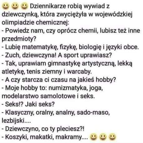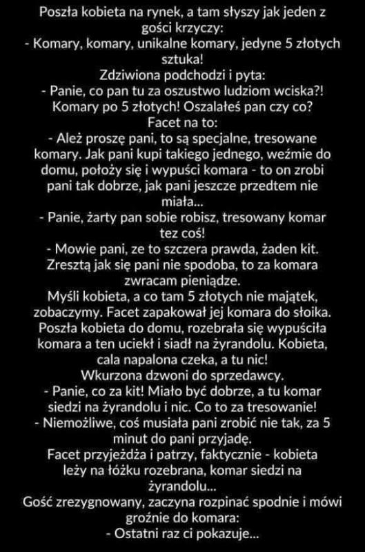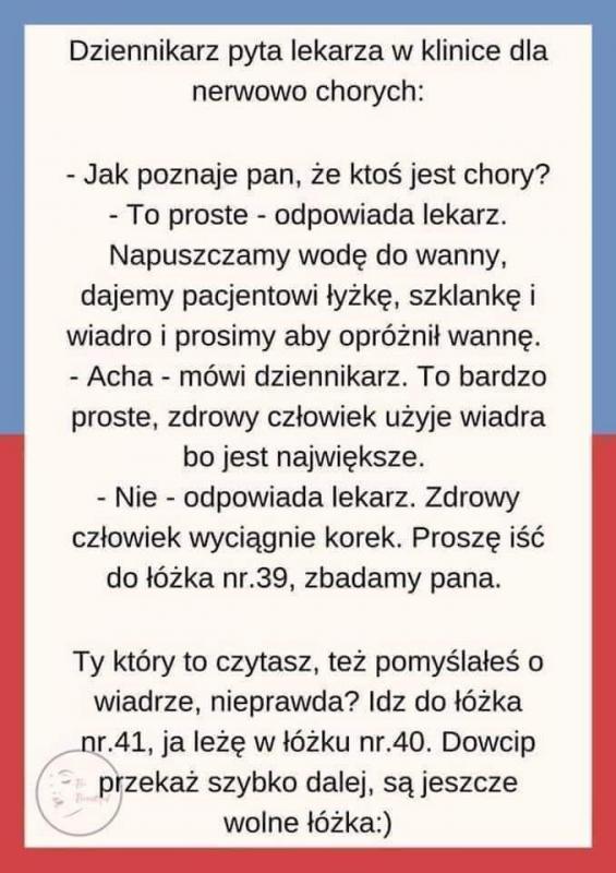 Adaś Niezgódka Opublikowano 21 Grudnia 2021 Zgłoś Udostępnij Opublikowano 21 Grudnia 2021 (edytowane) Strażnik PSR zatrzymuje nad wodą wędkarza z wędką i wiadrem pełnym ryb. Panie, nie za dużo tych rybek Pan ma, a tak w ogóle to karta opłacona ? Gość na to: Panie strażniku to są moje prywatne ryby, ja co dzień z rana pakuję je do wiadra, przychodzę tutaj i wpuszczam do tej wody żeby sobie popływały.Jak już sobie popływają to wkładam wiadro do wody, gwiżdżę a one wracają do wiadra.Jak Pan chce to Panu pokarzę. Strażnik zrobił wielkie gały ale ciekawość wzięła górę i zgodził się na pokaz.Gość wypuścił ryby i tak sobie stoją 5-10-15min.W końcu strażnik nie wytrzymał i mówi: Panie starczy tego spaceru, gwizdaj Pan na te ryby. A wędkarz na to: JAKIE RYBY ??? Edytowane 21 Grudnia 2021 przez Adaś Niezgódka 3 Cytuj Odnośnik do komentarza Udostępnij na innych stronach Więcej opcji udostępniania...
