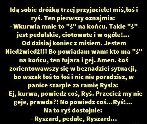 Artech Opublikowano 21 Grudnia 2021 Zgłoś Udostępnij Opublikowano 21 Grudnia 2021 Chyba już to pisałem ale że święta się zbliżają napiszę jeszcze raz Siedzi gość na dworcu PKP przed samymi #wietami, załamany, przybity, łzy w oczach i mało co depresja nie wiebała mu się na ciało. Po chwili podchodzi do niego Święty Mikołaj i pytaCo się dzieje z tobą, coś taki nie do życia? A Mikołaju lepiej nie pytaj, u mnie nic innego tylko pierdolnać pod pociąg No nie, nie mów takich rzeczy. Powiedz mi o co chodzi! Mikołaju, żona mie zdradza, firma jest na skraju bankructwa, urząd skarbowy wlazł na konto i je zablokował, kontracheńci zerwali umowy, kurwa nic innego tylko jebnąć samobuja Słuchaj, zbliżają się Święta, ja jestem Świętym Mikołajem mogę sprawić że wszystko wróci do normy. Po prostu wrócisz do domu i tam będzie czekać na ciebie kochająca żona, firma wróci na własny tor, konto odblokowane, mało tego, widzidzisz to Ferrari przed dworcem?Tak Popatrz, to są kluczyki do niego. One mogą być za chwilę twoje.Tylko jest jeden warunekJaki?Musisz mi zrobić lodaNo co ty Mikołaju, ale jak to, przecieżPowiedziałem, wszystko wróci do normy ale jeden warunek. Zastanów się i daj szybką odpowiedźGość myśli, myśli Kurde, jednego loda i jestem ustawiony tak jak chciałem w swym życiuNo dobra Mikołaju, zrobię Ci tego loda, poszli w odpowiednie miejsce, gość odpierdolił gałkę, mordę wyciera i Mikołaj po chwili Słuchaj, jak masz na imię i ile masz lat? Andrzej, 44 lata I TY WIERZYSZ W ŚWIĘTEGO MIKOŁAJA?Drogi Sławku, Ty w liście do Świętego Mikołaja poproś o słownik ortograficzny... 7 Cytuj Odnośnik do komentarza Udostępnij na innych stronach Więcej opcji udostępniania...