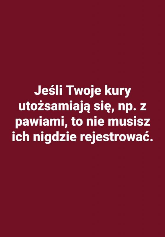 Odnośnie rejestracji kur to trzeba protestować, a nie się śmiać. Pętelka zaciska się już na jeść jakieś mięso nieskażone antybiotykami spoza korporacji czyli żyć albo nie żyć, ale u nas jak zwykle ... Polacy nic się stało ...