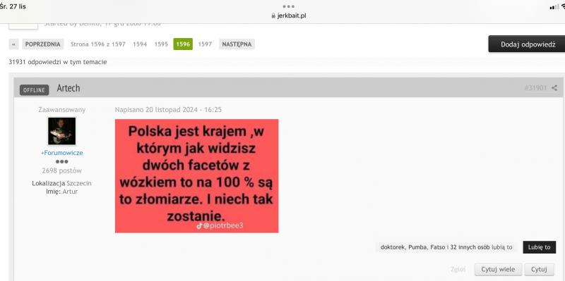 Darek_W Opublikowano 27 Listopada 2024 Zgłoś Udostępnij Opublikowano 27 Listopada 2024 (edytowane) Kurczę ale co naruszyłem? W sensie że wszystko nawet mały żart z osoby publicznej, zupełnie nie mający zabarwienia politycznego coś naruszył? Bo chciałbym zrozumieć widząc poprzednie wpisy? Czy to dotyczy tylko mnie? Fotek złowionych ryb już nie wstawiam… Edit: i jeszcze widzę punk ostrzeżenie Edytowane 27 Listopada 2024 przez Darek_W 1 Cytuj Odnośnik do komentarza Udostępnij na innych stronach Więcej opcji udostępniania...