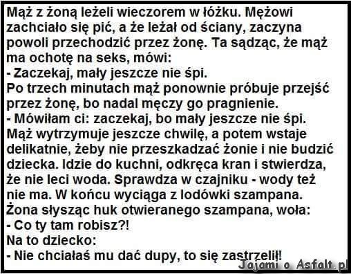 coma Opublikowano 17 Sierpnia 2016 Zgłoś Udostępnij Opublikowano 17 Sierpnia 2016 – Dlaczego nie zgłosił pan wcześniej kradzieży karty kredytowej?– Złodziej wydawał mniej niż moja żona.– Więc dlaczego teraz pan to zgłasza?– Chyba żona złodzieja się do niej dorwała… 7 Cytuj Odnośnik do komentarza Udostępnij na innych stronach Więcej opcji udostępniania...