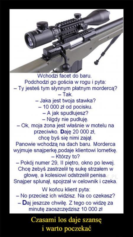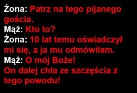 Lord Opublikowano 27 Kwietnia 2017 Zgłoś Udostępnij Opublikowano 27 Kwietnia 2017 (edytowane) Facet po śmierci trafił do piekła. Schodzi na dół, a tam od progu wita go diabeł. Wziął go ze sobą, oprowadza po piekle, pokazuje wszystko i pyta:- Pijesz?- Piję.- No to w poniedziałki w całym piekle pijemy wszystko co się da, wóda, wino, piwo, alkohole z każdego zakątka świata, bez ograniczeń!No fajnie, myśli sobie facet. Idą dalej, diabeł znów pyta:- Palisz?- Palę.- We wtorki wszyscy jaramy to co kto chce, mamy tu najlepszy tytoń, najlepsze zioło, bierzesz i palisz cały dzień!Nieźle, nieźle pomyślał facet, i poszedł z diabłem dalej. Ten znów pyta:- A imprezy lubisz?- Lubię.- No to w środę całe piekło się bawi, najlepsza muzyka, najlepsi DJ-e, calutki dzień!Facet ucieszony, kto by pomyślał, że w piekle tak fajnie będzie. Zwiedza z diabłem dalej, i diabeł znów zadaje pytanie:- Jesteś gejem?- Nie.- To czwartków nie polubisz. Diabeł porwał Niemca,Rosjanina i Polaka i mowi : Wypuszcze Was jeśli mi powiecie liczbe ktorej nie jestem sobie w stanie wyobraźić.Na pierwszy ogień poszedł Niemiec:-Biliard.-No jestem sobie w stanie wyobraźic tak liczbe...Rosjanin sie wycfanił i mowi:-Biliard Biliardów.Diabeł mysli myśli i mowi : No moge sobie wyobrźic taka liczbe.Podchodzi do Polaka : A ty czym mnie zaskoczysz?Polak : W Ch*j!Diabeł wymiękł, puścił Polaka ale zaciekawilo go ile to jest... Wybrał sie do Polski i podbija do przechodnia:-Panie ile to jest w ch*j ?-A widzisz Pan to dzewo ?- No widze...-To jak z tąd do tamtego dzewa i jeszcze w pizdu ! Edytowane 27 Kwietnia 2017 przez Lord 9 Cytuj Odnośnik do komentarza Udostępnij na innych stronach Więcej opcji udostępniania...