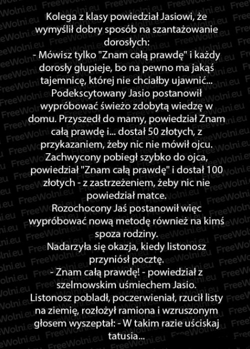 Gabriel Kozdraś Opublikowano 8 Maja 2017 Zgłoś Udostępnij Opublikowano 8 Maja 2017 Przypomina mi się dowcip,Marian, ten ?Matura 1960 r. Drwal sprzedał drewno za 100 zł. Wycięcie drzewa na to drewno kosztowało go 4/5 tej kwoty. Ile zarobił drwal? Matura 1970 r. Drwal sprzedał drewno za 100 zł. Koszty uzyskania przychodu wyniosły 4/5 tej kwoty. Ile zarobił drwal? Matura 1980 r. Drwal sprzedał drewno za 100 zł. Koszty uzyskania przychodu wyniosły 4/5 tej kwoty. Ile procent stanowi zysk drwala? Matura 1990 r. Drwal sprzedał drewno za 100 zł. Koszty uzyskania przychodu wyniosły 4/5 tej kwoty. Ile zarobił drwal i jaki wpływ miała jego praca na otoczenie drzewa (uwzględnij sąsiadującą z drzewem florę i faunę)? Matura 2000 r. (tylko dla zainteresowanych) Drwal sprzedał drewno za 100 zł. W tym celu musiał wyciąć kilka starych drzew. Opisz w kilku zdaniach, jak w tej sytuacji czuły się biedne zwierzątka leśne i rośliny? Jak bardzo niekorzystne dla środowiska jest wycinanie starych drzew? Matura 2010 r. Drwal sprzedał drewno za 100 zł. Wycięcie drzewa na to drewno kosztowało go 4/5 tej kwoty, czyli 80 zł. Drwal zarobił 20 zł. Zakreśl liczbę 20. Matura 2020 r. Drwal sprzedał drewno za 100 zł. Pokoloruj drwala. 9 Cytuj Odnośnik do komentarza Udostępnij na innych stronach Więcej opcji udostępniania...