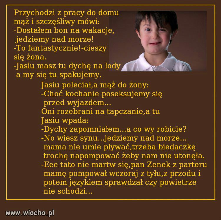 Krzysiu Opublikowano 13 Listopada 2017 Zgłoś Udostępnij Opublikowano 13 Listopada 2017 Troche wulgarnie ale to cały sens dowcipu. Przychodzi facet do lekarza:- boli mnie chuj!- jak pan mówi? - nie, jak rucham 8 Cytuj Odnośnik do komentarza Udostępnij na innych stronach Więcej opcji udostępniania...