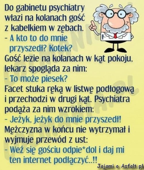 Krzysiu Opublikowano 24 Stycznia 2018 Zgłoś Udostępnij Opublikowano 24 Stycznia 2018 Jeden facet w urzędzie pośrednictwa pracy w Mielcu zobaczył anons dotyczący pracy jako "Asystent Ginekologa". Żywo zainteresowany zapytuje urzędnika o szczegóły. Urzędnik odpowiada że praca polega na przygotowaniu kobiet do badania, a więc:- pomoc kobietom rozebrać się, położyć je na łóżku- następnie ostrożnie umyć ich "intymne miejsca"- następnie zaaplikować krem do golenia i ostrożnie ogolić włosy tam na dole- i na koniec wmasować olejek w te miejsca które będą badane tak, żeby kobieta była gotowa do badania.- pensja jest 5.300 złotych + dodatki, ale jak chcesz tę pracę, to musisz pojechać do Bielska-Białej.Facet pyta urzędnika :- A wiec praca jest w Bielsku?- Nie - odpowiada urzędnik - praca jest w Mielcu, natomiast w Bielsku-Białej jest koniec kolejki... 11 Cytuj Odnośnik do komentarza Udostępnij na innych stronach Więcej opcji udostępniania...