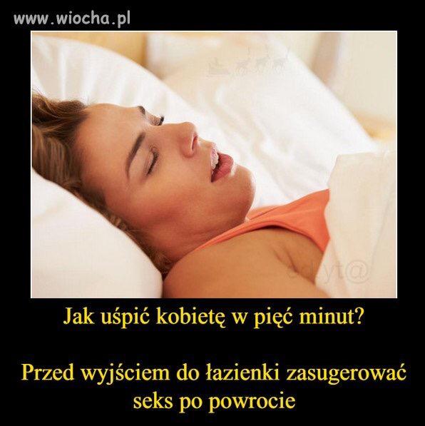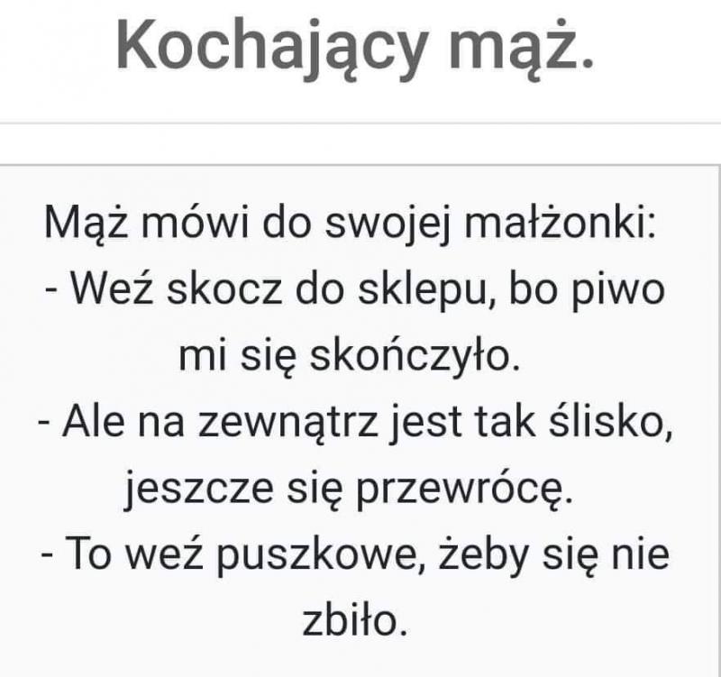 domeldoom Opublikowano 30 Listopada 2018 Zgłoś Udostępnij Opublikowano 30 Listopada 2018 (edytowane) 3. Pewna kobitka miała problem z mężem - strasznie bidulek chrapał, co nie pozwalało jej się w nocy wyspać. Chodzili po lekarzach, specjalistach... nic. Pewnego dni spotkała sąsiadkę i gdy jej opowiedziała o problemie, ta zaproponowała jej wizytę u pewnej znachorki, która ponoć wszystkie przypadłości leczyć umie. Kobita leci pod wskazany adres, przedstawia sytuację, ta chwilę się zastanawia i mówi:- Jak stary zacznie chrapać, to niech paniusia mu nogi rozszerzy.Kobita się wqr..., opieprzyła znachorkę, że naiwnych ludzi tylko naciągać umie i że złamanego grosza jej nie da i poleciała do chaty. W nocy ta sama historia... stary piłuje już drugą godzinę... kobitka myśli sobie: "Ehh... spróbuję tak zrobić, jak znachorka mówiła...".Rozszerza staremu nogi i... cisza... Następnego dnia leci z samego rana do znachorki... przeprosiny... bombonierka... podwójne honorarium... Oczywiście ciekawość nie dawała jej spokoju więc pyta:- Pani... ale na czym polega ten trick z tymi nogami?!Znachorka:- Moja droga... zasada jest prosta - rozszerza Pani nogi, worek spada na dziurę i cugu ni ma...4. W pociągu kolei transsyberyjskiej:- Zdrastwuj Sasza, kuda ty jediosz?- Zdrastwuj, Wania. Iz Maskwy we Władywostok. A Ty?- Iz Władywostoka w Maskwu.- Wot, tiechnika... pomyslał po chwili Sasza5. Pani doktor, mam problem. Członek mi nie staje. Doktor ujęła członka w dłoń i ten się naprężył.- Przecież staje!- No tak, ale nie mam wytrysku.Doktorka poruszała trochę ręką i wytrysk nastąpił.- No i czego Pan jeszcze chce?- Buzi6. Pacjent w prywatnym szpitalu ustala szczegóły dotyczące zabiegu. Rozmowa z anestezjologiem:- A ile będzie kosztować narkoza?- 1200 zł.- 1200 zł za to, żeby mi się film urwał?! Trochę drogo, nie sądzi pan?- Nie. Urwany film dostaje pan gratis. Opłata jest za to, żeby się znowu zaczął wyświetlać.7. - Siostro! Po co mówiliście pacjentowi z siódemki, że chcemy mu nogi uciąć?!- A co, uciekł?- Tak!- A pan doktor mówił, że ten paraliż to nieuleczalny jest... Edytowane 30 Listopada 2018 przez woblery z Bielska 4 Cytuj Odnośnik do komentarza Udostępnij na innych stronach Więcej opcji udostępniania...