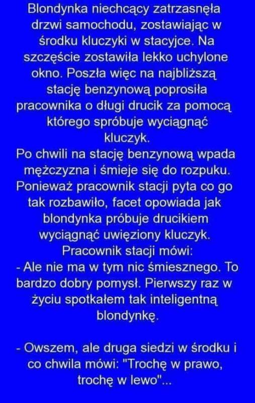 piter v Opublikowano 18 Grudnia 2018 Zgłoś Udostępnij Opublikowano 18 Grudnia 2018 - Jestem lesbijką - mówi córka do ojca. - W porządku. - Tato, ja też jestem lesbijką... - mówi druga córka. - Boże, czy w tej rodzinie naprawdę nikt nie lubi penisów?! - pyta ojciec. - Ja lubię... - wtrąca się syn. Żona dzwoni do męża do pracy: - Kochanie rano przez pomyłkę zamiast tabletek na rozwolnienie dałam ci na uspokojenie. Wszystko w porządku u ciebie? Jak się czujesz? - Osrany, ale spokojny. W szpitalu pielęgniarka ma ogolić 80-letniego pacjenta przed operacją. Konkretnie chodzi o pachwiny. Rozbiera pacjenta i widzi ogromny interes. Nie może powstrzymać się od uwagi: - Dziadku, ależ to prawdziwy młot! Dziadek dumnie: - Jeszcze 10 lat temu wieszałem na nim wiadro z wodą i przenosiłem 100 metrów od studni do domu bez pomocy rąk! - A teraz się to już niestety nie udaje? - Ano nie, kolana po drodze wysiadają. 2 Cytuj Odnośnik do komentarza Udostępnij na innych stronach Więcej opcji udostępniania...