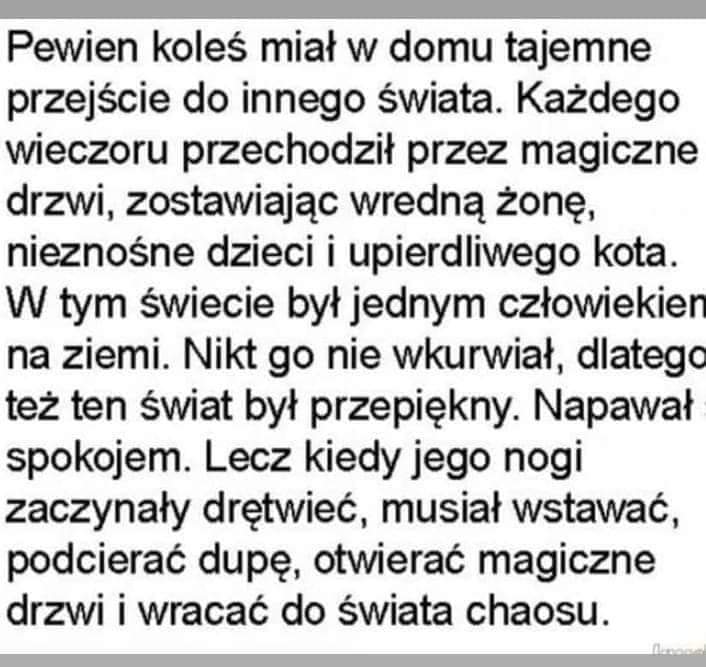 Konstanty Opublikowano 22 Listopada 2019 Zgłoś Udostępnij Opublikowano 22 Listopada 2019 małżeństwo szuka mieszkania do wynajęciaznaleźli biuro pośrednictwa, są propozycje lokaliumówili się i oglądają poszli do przytulnego mieszkanka z panią z biura pośrednictwa, wszystko w miarę pasujeale w imieniu wynajmującego pani z biura ma kilka pytań, zanim podpiszą umowę najmu:- państwo są małżeństwem, tak?- tak- pracują państwo oboje, tak?- tak- dzieci?- tak są, dwójka- zwierzęta?- nie, skąd - to naprawdę grzeczne dwa chłopaki;-) 5 Cytuj Odnośnik do komentarza Udostępnij na innych stronach Więcej opcji udostępniania...