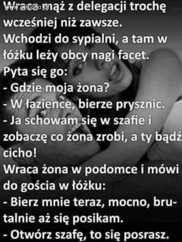 wobo Opublikowano 24 Listopada 2019 Zgłoś Udostępnij Opublikowano 24 Listopada 2019 Znam troszkę inną wersję tego wyżej. Siedzi facet z wędką nad brzegiem, a w wyciągniętej w górę ręce trzyma cegłę.Przechodzi kobieta...- Panie, że wędka to rozumiem, ale po co ta cegła?-Jak mi się pani odda to powiemKobieta oburzona odchodzi, no ale ciekawość ją zżera... wraca...- No dobrze - oddam się byle szybko, żeby kto nie zobaczył.Facet zrobił co miał zrobić...- I po co panu ta cegła?No widzi pani - na wędkę na razie nic, ale na cegłę to już pani jest trzecia. 2 Cytuj Odnośnik do komentarza Udostępnij na innych stronach Więcej opcji udostępniania...