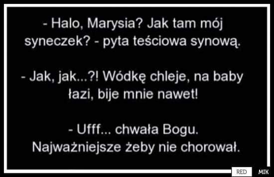 anpart Opublikowano 28 Stycznia 2020 Zgłoś Udostępnij Opublikowano 28 Stycznia 2020 (edytowane) Mąż wraca po nocy spędzonej poza domemŻona gdzie byłeś?Na rybach...Złapałeś coś?Mam nadzieję, że nie... Edytowane 28 Stycznia 2020 przez anpart 4 Cytuj Odnośnik do komentarza Udostępnij na innych stronach Więcej opcji udostępniania...