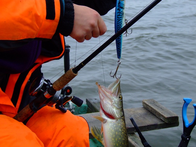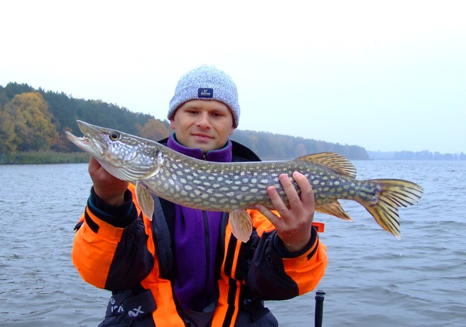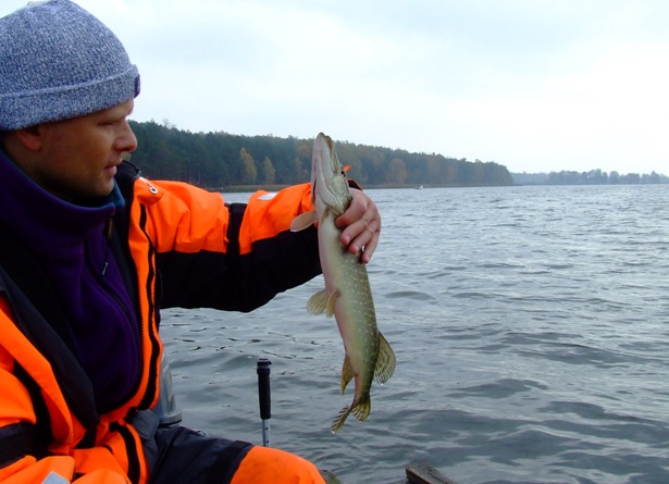Tego dnia padł jednak jeszcze mniejszy szczupak na… Whitefisha 18. Co ciekawe, z przełyku wystawało mu pół metra plecionki z krętlikiem i kawałkiem żyłki. Jak widać głupotę miał w genach. Obcięliśmy to świństwo jak najkrócej się dało, być może ratując mu życie.