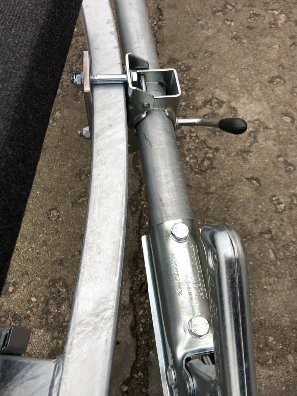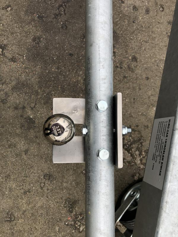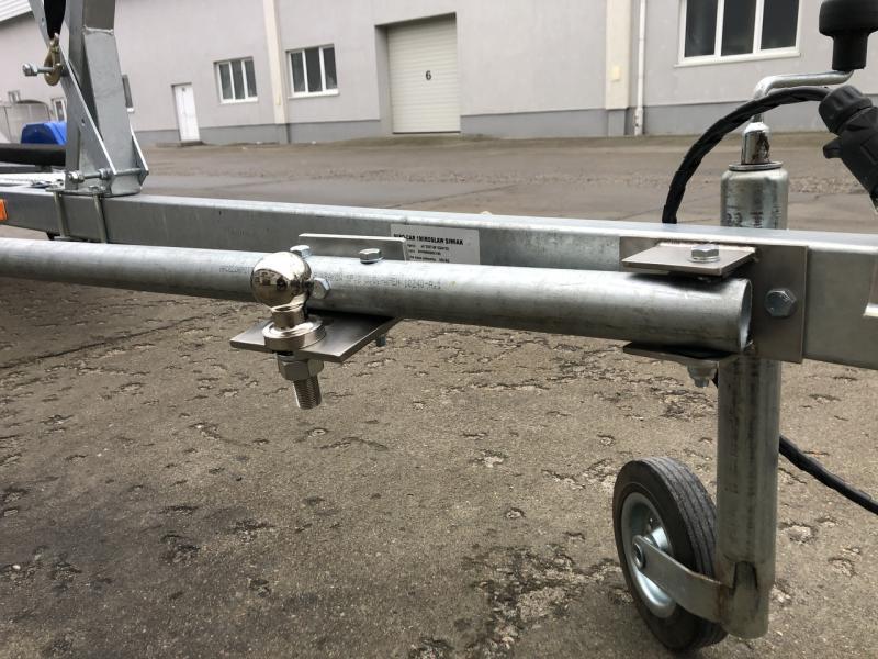 Wykonałem ten patent, łódkę trzeba wodować z opuszczonym kołem podporowym najlepiej koło pompowane. Rura ocynkowana długości 3m, średnica 48,3x2,9 inaczej 6/4" do tego zaczep kulowy gwintowany, oraz uchwyt do zaczepu kulowego na drugą stronę rury. Cały element obraca się na zawiasie własnej roboty. a mocowanie po złożeniu jest na uchwycie od koła podporowego. Załączam link do filmiku.