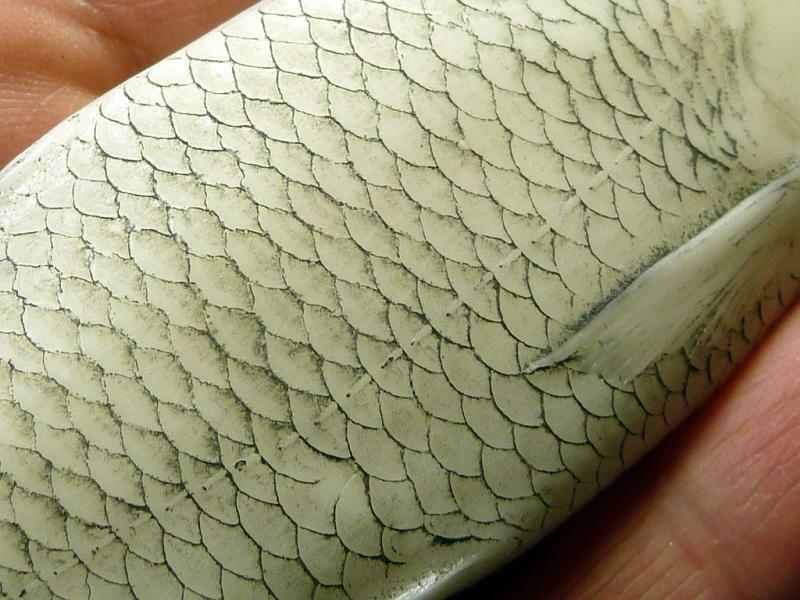 To dopiero początek drogi.Po niedzieli forma leci do Zelldo i będzie modelował korpus.Trzeba poprawić troszkę płetwy piersiowe.Zrobić wnęki na oczy które będą jak w żywej płotce.Tymczasem z detali jestem zadowolony.Łuskę zdołałem na tyle podnieść że będzie wyraźna po kryciu lakierem.Po za tym będzie jeszcze nowy typ malowania konturowego który uwydatni wszystkie szczegóły.Trzymajcie kciuki.