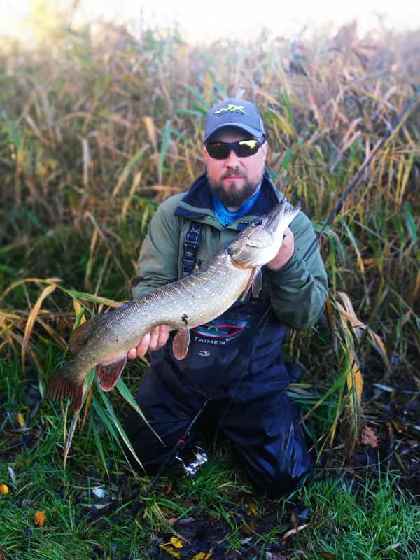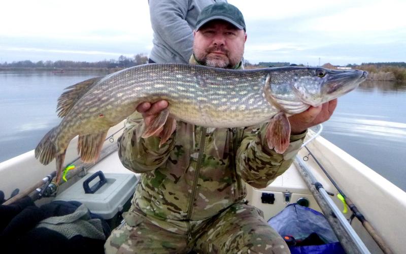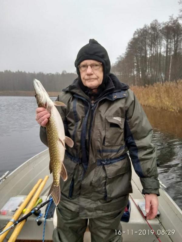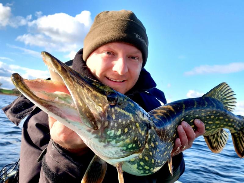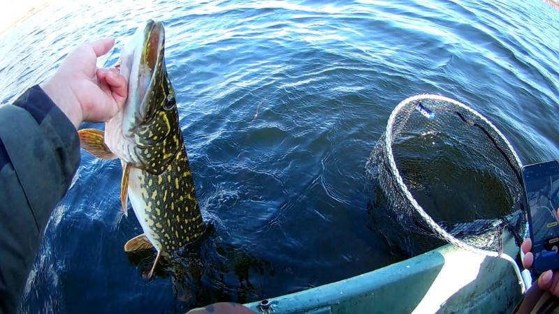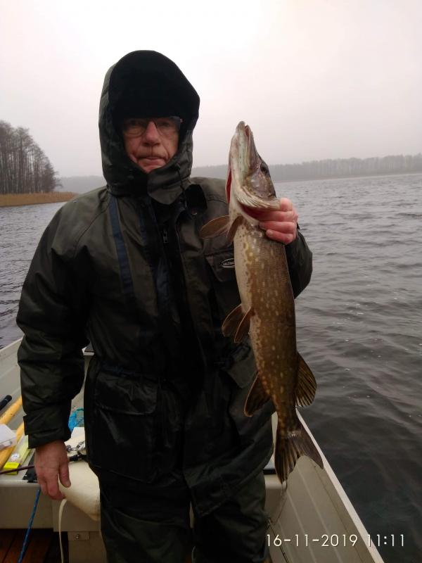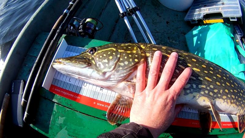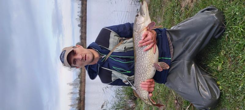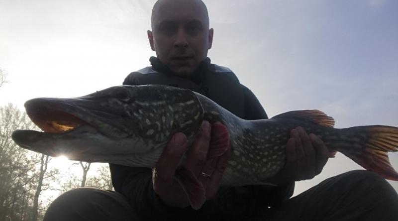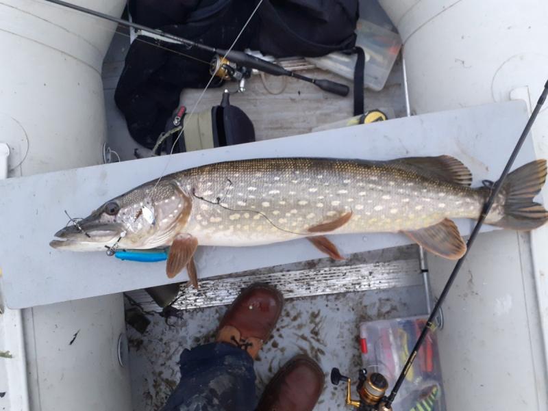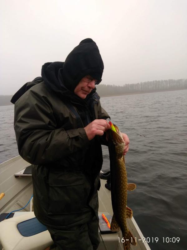 Wyjazd z założenia miał być z naciskiem na sandacza, jak to czasami bywa nie ma nic pewnego i zamiast sandaczy były szczupaki ,pierwsza ryba na miejscówce dość szybko melduję się na wędce lecz nie chce zawitać na pokładzie pontonu i spada ,dramatu nie ma ,przez chwilę przechodza po głowie takie myśli co poszło nie tak ,już kolejne branie jest z pozytywnym finałem, szczupak ładnie wcięty i nie na problemu z jego wyholowaniem, niestety rozmiarem nie poraża ot taki sredniaczek ,czas mija szybko słońce jest już dość nisko na horyzoncie ,ciągle łowię z podbicia dość agresywnie w nadziei na uderzenie sandacza ,przy trzecim podbiciu czekam aż guma opadnie do dna i nic takiego się nie dzieje, nie czuje w ogóle kontaktu z przynęta, szybka weryfikacja tej sytuacji ,kilka obrotów korbką i czuję poterzne szarpniecie, odruchowo przycinam i się zaczyna ,Matagi fajnie się wygina już wiem że to nie jest już średniaczek ,bliżej pontonu ryba jeszcze bardziej uświadcza mnie w przekonaniu że do małych nie należy ,odchodzi od pontonu zabierając kilka metrów plecionki ,po czym pokazuje się na powierzchni i wtedy już pewny jestem że to duży szczupak, robi jeszcze tzw.świecę i ponownie nurkuje w głąb wody ,odpływa ponton praktycznie do okoła, ani myśli tak łatwo się poddać, czuje jak trzęsie łbem, wywołując u mnie obawy czy aby uda się ją wyholować, ostatecznie słabnie i daje się podebrać ,jak się okazało to była ostatnia ryba wyjazdu .
