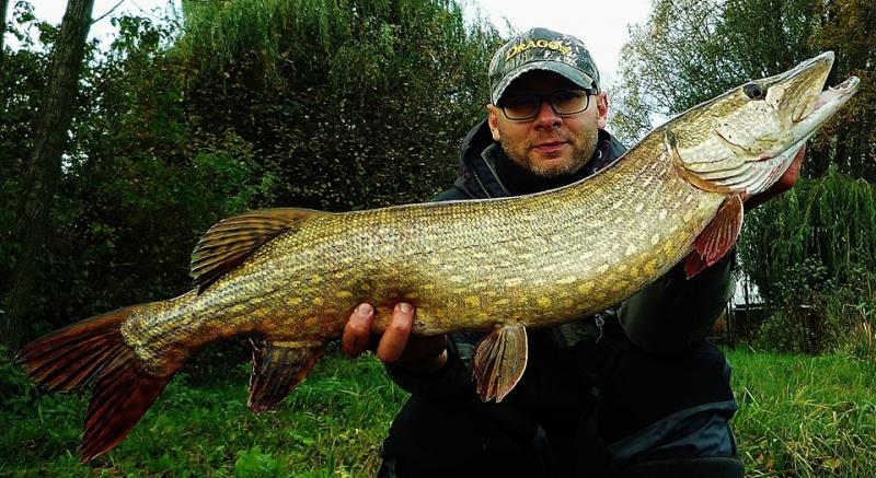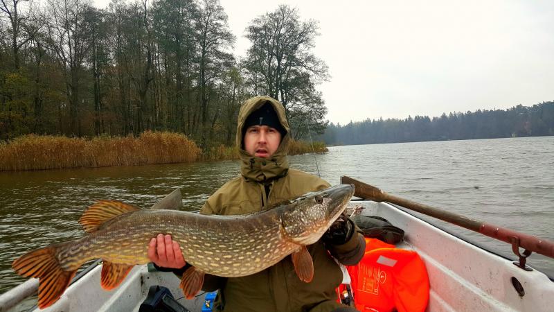 Wczoraj nie mogłem się zdecydować czy jechać na szczupaki czy na sandacze. Jako że w pierwszej chwili pomyślałem o szczupakach, zapadła decyzja, że dzisiejszy wyjazd dedykowany będzie kaczodziobym, i nie pomyliłem się. Piękna mama (111 cm 10.7kg) skusiła się na złoto-czarnego piga 23 cm (mój ulubiony). Branie z czystej 2-metrowej wody z obumierającą roślinnością.