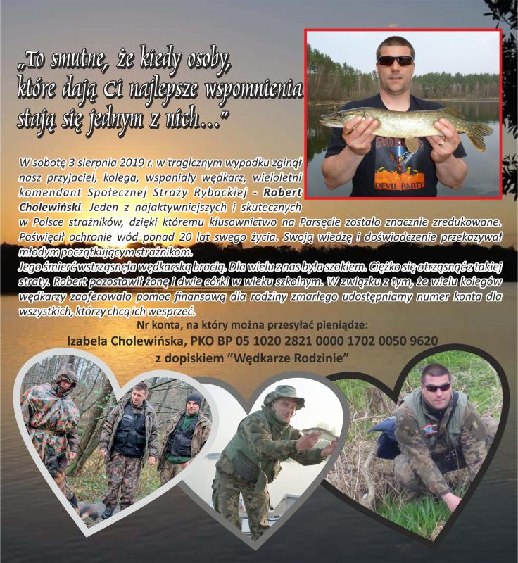 Goodstuff Opublikowano 13 Sierpnia 2019 Zgłoś Udostępnij Opublikowano 13 Sierpnia 2019 Szanowni forumowicze,do wielu z Was zapewne dotarła już przykra informacja o śmierci Roberta Cholewińskiego."Bobek" od 20 lat zaangażowany był w ochronę dorzecza Parsęty. Zginął 3 sierpnia w tragicznym wypadku podczas działań patrolowych.Zapamiętamy go jako zapalonego wędkarza i komendanta SSR, który wytrwale i bezkompromisowo dążył do zwalczenia kłusownictwa nad Parsętą. Przede wszystkim pamiętamy też, że Robert był kochającym mężem oraz tatą dwóch córek.Możecie wesprzeć rodzinę Roberta, która wdzięczna będzie za każdą pomoc. Córki Roberta są w wieku szkolnym i zasługują na dobrą edukację.Poniżej grafika, na której znajdziecie numer konta.Jest to inicjatywa strażników i wędkarzy znad Parsęty. 7 Odnośnik do komentarza Udostępnij na innych stronach Więcej opcji udostępniania...