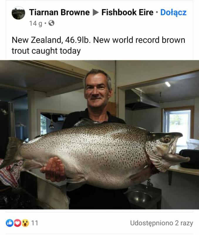 Gadda Opublikowano 29 Października 2020 Zgłoś Udostępnij Opublikowano 29 Października 2020 (edytowane) Facet który trzyma tego pstrąga to taxydermista, czyli specjalista od wypychania zwierząt. Łowca (który chciał być anonimowy) podarował go wędkarskiej knajpie, aby zawisnął na ścianie, obok dwóch poprzednich rekordów świata. Ten na zdjęciu ma 44,3 lb czyli 20,1 kg.we wpisie umieszczonym powyżej widzę, że już trochę urósł... i jest nowym rekordem świata. Co kraj, to obyczaj...https://www.stuff.co.nz/timaru-herald/news/300143657/fisherman-who-landed-massive-trout-in-mackenzie-wishes-to-remain-anonymous?fbclid=IwAR3qkZbqWHq6UnrYguFV4bUonP-KEcx6e7AXwPZ3MQO6vPI0CunLAOTeWlo Edytowane 29 Października 2020 przez HighRider 4 Cytuj Odnośnik do komentarza Udostępnij na innych stronach Więcej opcji udostępniania...