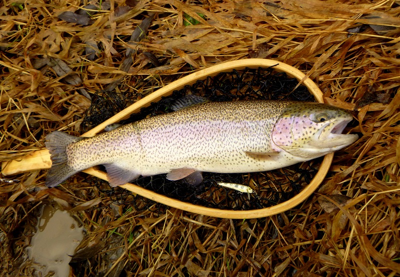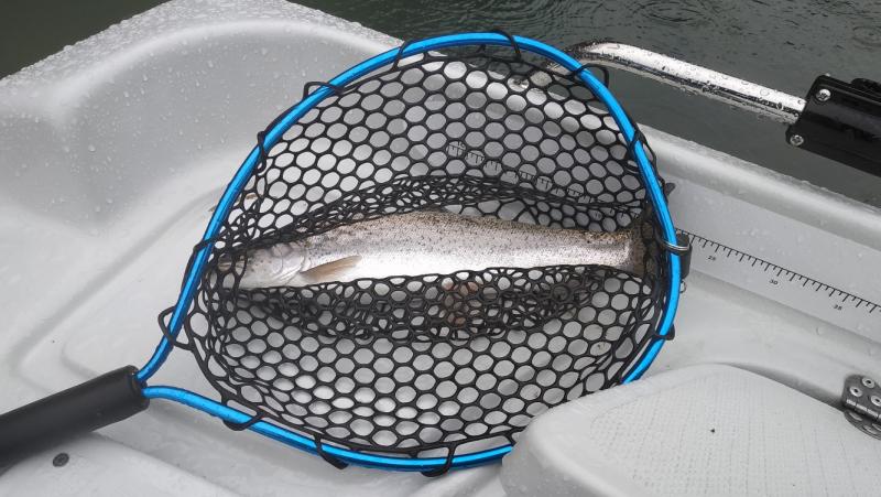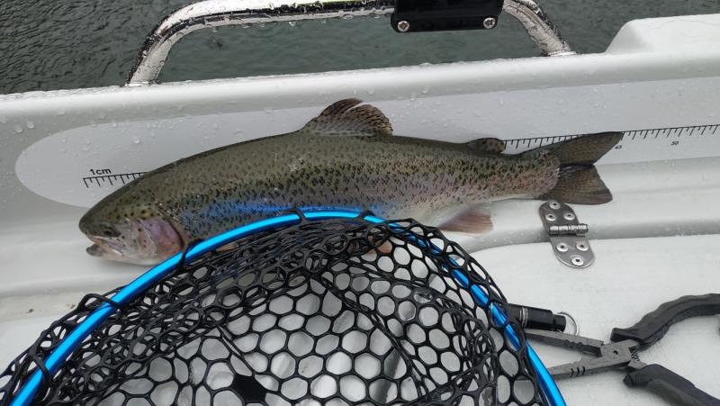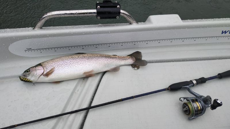 Cały dzień dziś padało, spodnie na tyłku przemokły. W dłonie było mi tak zimno że musiałem walczyć z agrafką dłużej niż z rybą. :) Brań było całkiem sporo, wyjechały 4 tęczaki i jeden potok 46 cm. Ale już nawet smartfona nie wyciągałem. Rybki bardzo waleczne wróciły do wody. Sprzętowo: SPX-T682AJI / Ultegra 1000 HG / YGK egi metal pe 0.8