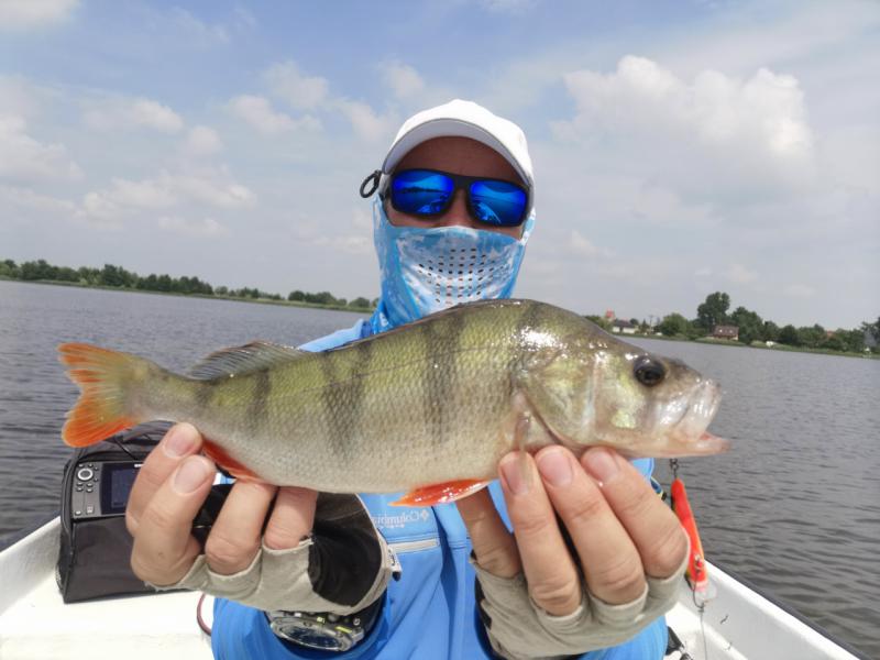 Okonie skończyły się na moich wodach już kilka lat temu , o czym wspominałem już nieraz . Mam nadzieję , że wynika to tylko z tego , iż przestałem im poświęcać dostatecznie dużo czasu , co przy ograniczeniu jednak zauważalnym populacji przekłada się na zanik wyników , a nie jest trendem już dokonanym . Tak czy inaczej , zarówno w moich małych i płytkich sadzawkach , jak i na dużej i głębokiej wodzie , tych pięknych pasiaczków ja i moi kompani już nie łowimy . Dlatego też każde z nimi spotkanie traktujemy jak święto , które przynosi masę radości i kończy się zawsze magiczną konkluzją , że "ale takich okoni to bym połowił - pamiętacie pięć lat temu ..."  :) .Inna sprawa , że takie spotkania mają miejsce najczęściej późną już jesienią przy okazji sandaczowych łowów , a ryby są wyrośnięte i pojedyncze niestety . Tuż po takim udanym holu momentalnie w ruch idą okoniówki , które chyba z czystego sentymentu mamy na łodzi , ale nie daje to nigdy żadnych efektów w postaci rozwiązania się worka z braniami czy choćby jednej powtórki . Samotne wilki , krążące po miejscówkach w towarzystwie sandaczy , to scenariusz najbardziej prawdopodobny w tym przypadku . Raz jeden w tym sezonie udało mi się trafić na aktywne stadko ryb , które w czerwcowym upale dały radochy na jakąś godzinkę i nawet jedna z nich była taka już zdjęciowa z lekka  :D . O dziwo nie gumowo i opadowo , a woblerowo i twitchowo . Zadziałał twitchingowy prototyp od @gajosika w kolorach intensywnych bardzo , a bardzo rzadko wykorzystywanych przeze mnie przy okoniowych łowach .