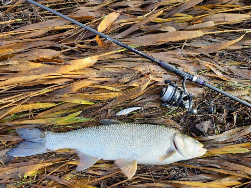 Tak, ten boleń to przyłów przy szukaniu sandaczy, choć niejako też się go spodziewałem, bo już wcześniej w tym miejscu się trafiały na przemian z mętnookimi. Tego dnia najpierw wyholowałem sandacza 60+, później po dłuższym czasie bez brań zmieniłem taktykę z woblera na gumę i w pierwszym rzucie taka świnka się zameldowała.