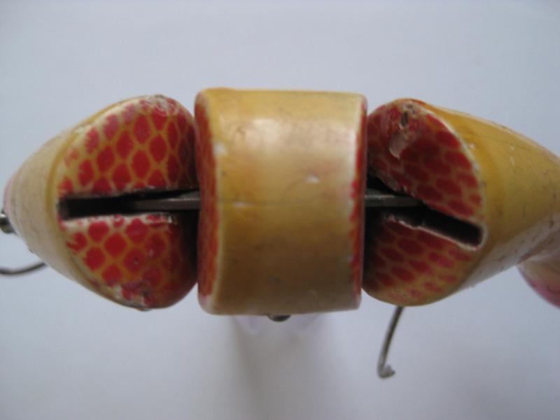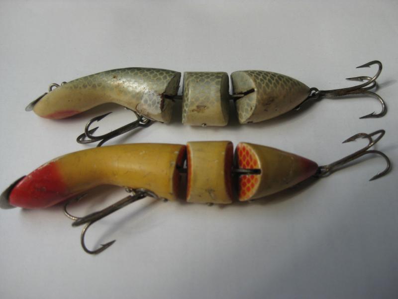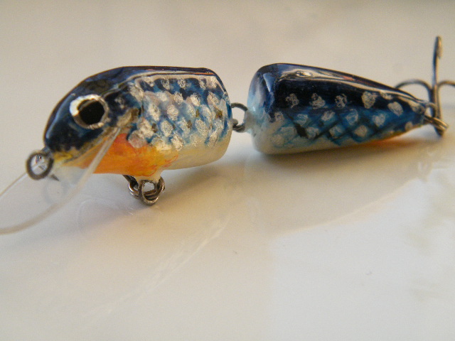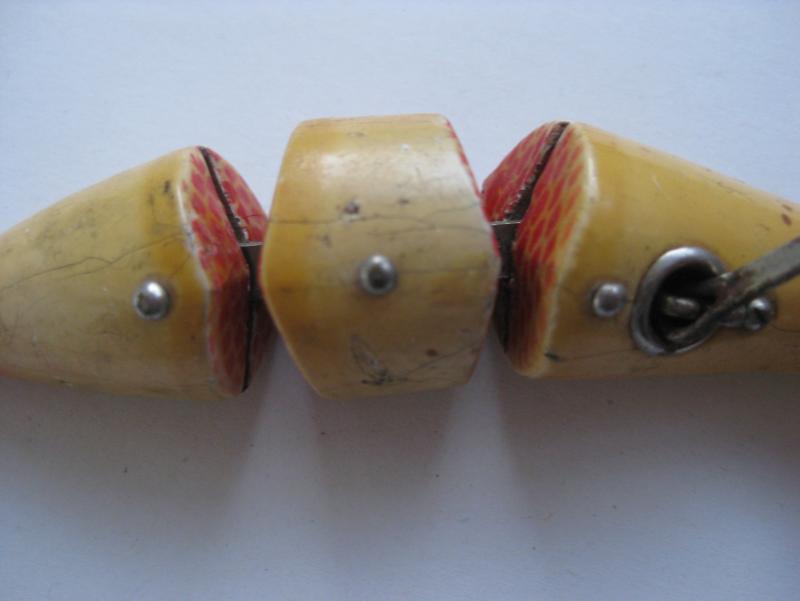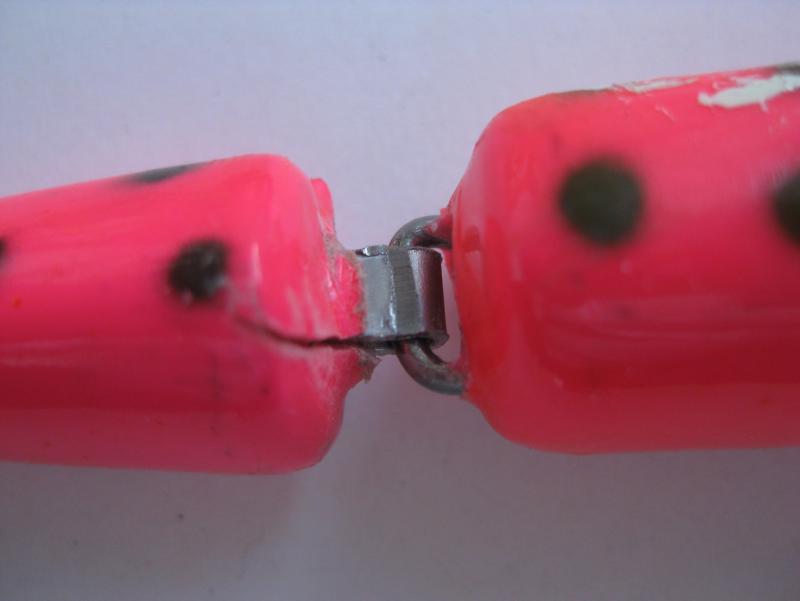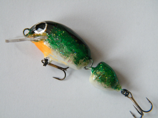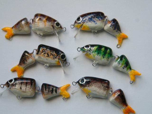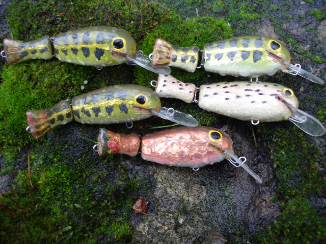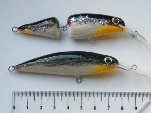 część systemów łączenia stosuję, a o innych nawet nie pomyślałem... no i praca w znacznym stopniu zależy również od obciążenia i kształtu korpusu... przykładowo ponizej masz woblery z nietypową dla tego rodzaju połaczenia pracą - taki wypadek przy pracy, ale bardzo łowny - niemal wyłącznie lusterkowanie o dużej amplitudzie wychyleń, zachowują się w wodzie niemal jak wobler jednoczęściowy... sorry za jakość, to dość stare zdjęcie:)